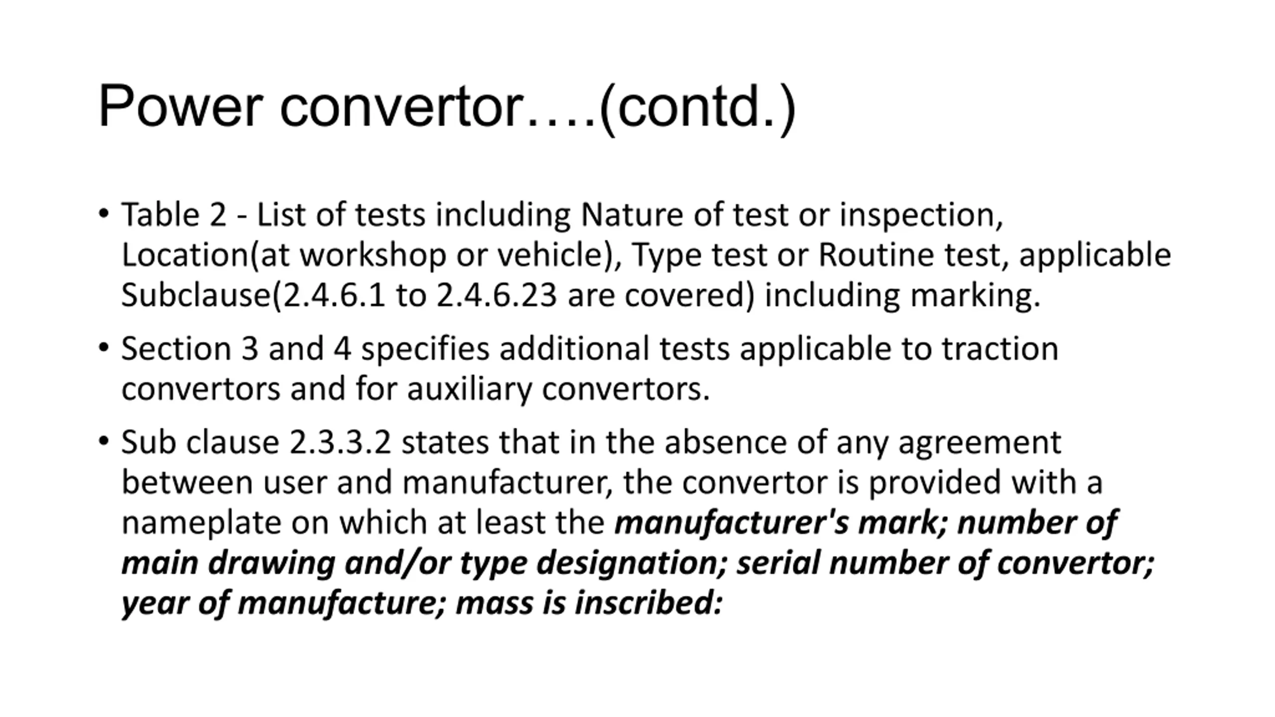 Power convertor.(contd.) Table 2 - List of tests including Nature of test or inspection, Location(at workshop or vehicle), Type test or Routine test, applicable Subclause(2.4.6.1 to 2.4.6.23 are covered) including marking. Section 3 and 4 specifies additional tests applicable to traction convertors and for auxiliary convertors. Sub clause 2.3.3.2 states that in the absence of any agreement between user and manufacturer, the convertor is provided with a nameplate on which at least the manufacturer's mark; number of main drawing and/or type designation; serial number of convertor; year of manufacture; mass is inscribed: