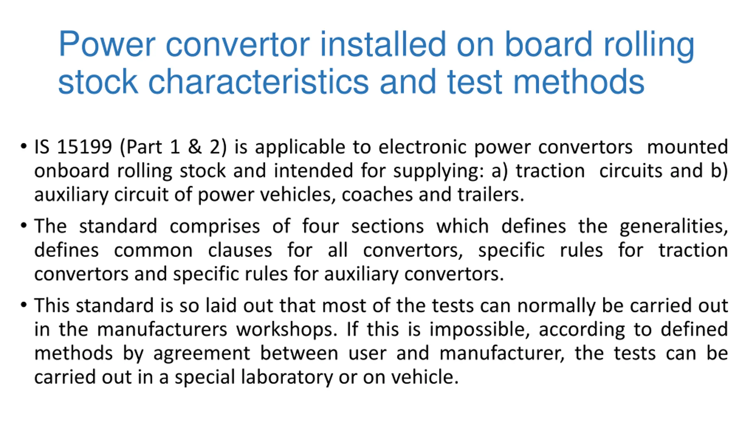 Power convertor installed on board rolling stock characteristics and test methods IS 15199 (Part 1 & 2) is applicable to electronic power convertors mounted onboard rolling stock and intended for supplying: a) traction circuits and b) auxiliary circuit of power vehicles, coaches and trailers. The standard comprises of four sections which defines the generalities, defines common clauses for all convertors, specific rules for traction convertors and specific rules for auxiliary convertors. This standard is so laid out that most of the tests can normally be carried out in the manufacturers workshops. If this is impossible, according to defined methods by agreement between user and manufacturer, the tests can be carried out in a special laboratory or on vehicle.