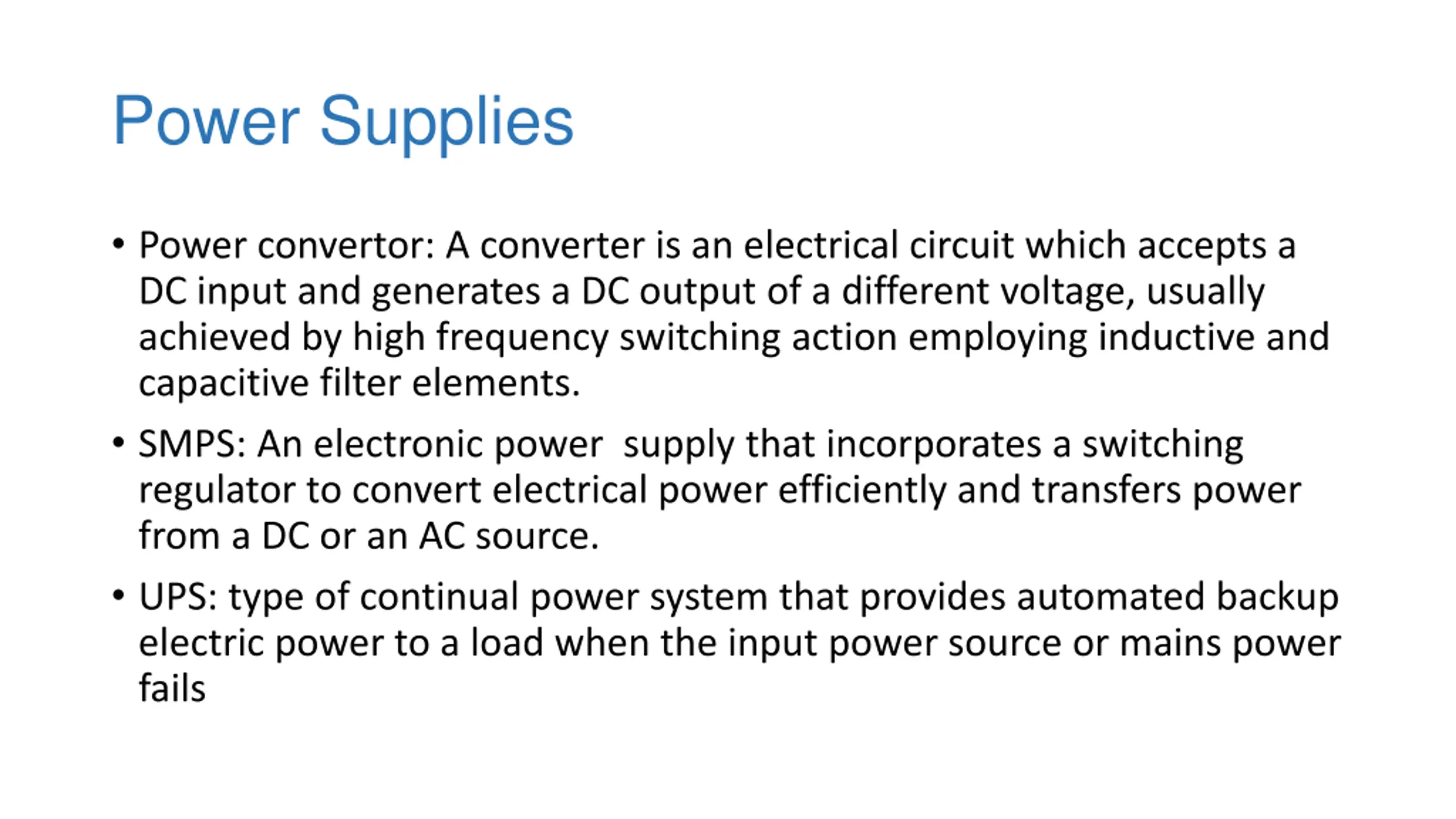 Power Supplies Power convertor: A converter is an electrical circuit which accepts a DC input and generates a DC output of a different voltage, usually achieved by high frequency switching action employing inductive and capacitive filter elements. SMPS: An electronic power supply that incorporates a switching regulator to convert electrical power efficiently and transfers power from a DC or an AC source. UPS: type of continual power system that provides automated backup electric power to a load when the input power source or mains power fails