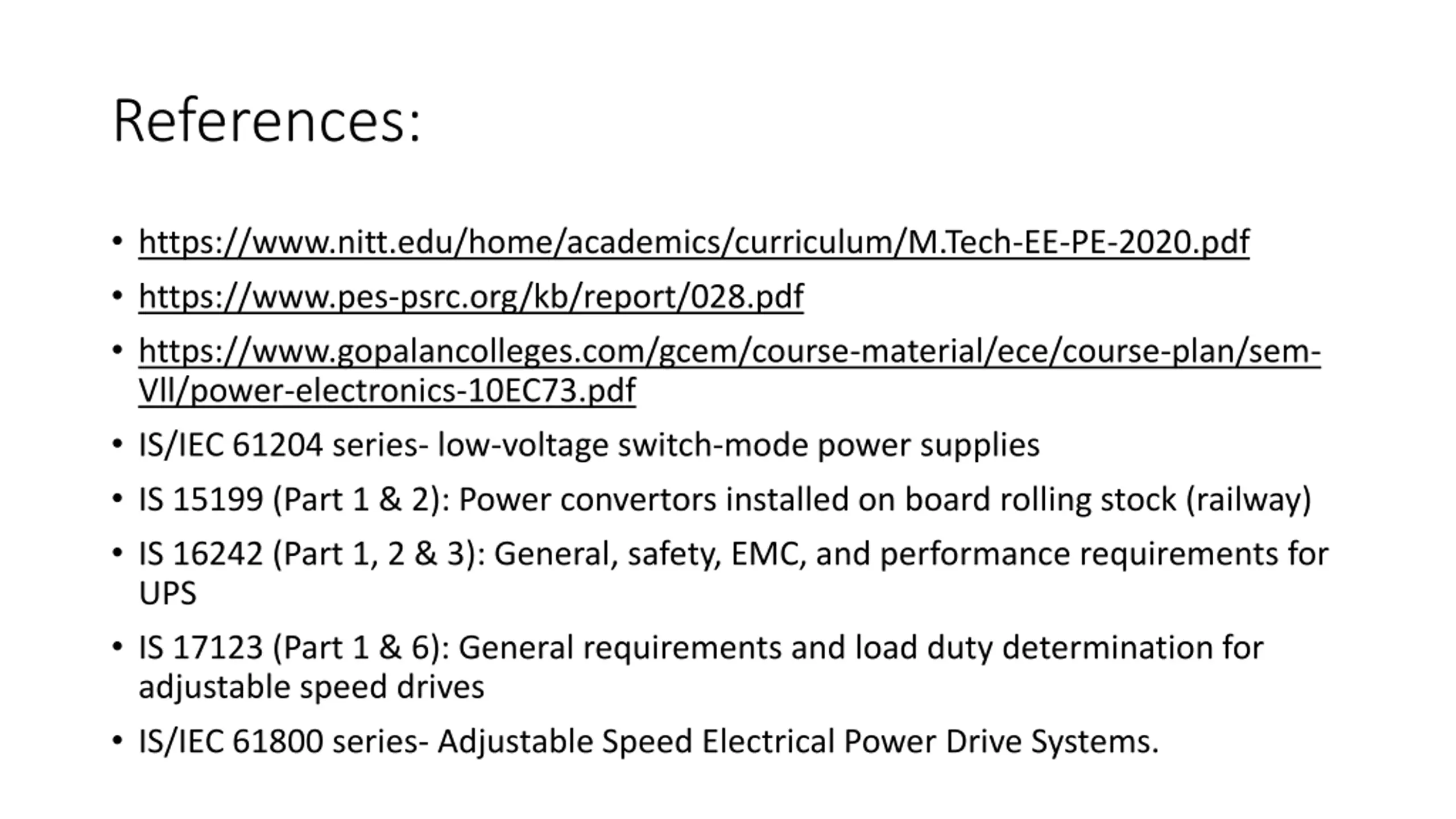 References: https://www.nitt.edu/home/academics/curriculum/M.Tech-EE-PE-2020.pdf https://www.pes-psrc.org/kb/report/028.pdf https://www.gopalancolleges.com/gcem/course-material/ece/course-plan/sem- Vll/power-electronics-10EC73.pdf IS/IEC 61204 series- low-voltage switch-mode power supplies IS 15199 (Part 1 & 2): Power convertors installed on board rolling stock (railway) IS 16242 (Part 1, 2 & 3): General, safety, EMC, and performance requirements for UPS IS 17123 (Part 1 & 6): General requirements and load duty determination for adjustable speed drives IS/IEC 61800 series- Adjustable Speed Electrical Power Drive Systems.