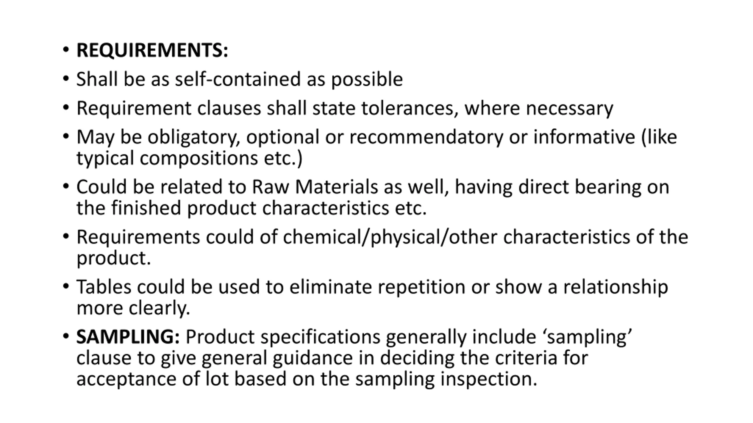 REQUIREMENTS: Shall be as self-contained as possible Requirement clauses shall state tolerances, where necessary May be obligatory, optional or recommendatory or informative (like typical compositions etc.) Could be related to Raw Materials as well, having direct bearing on the finished product characteristics etc. Requirements could of chemical/physical/other characteristics of the product. Tables could be used to eliminate repetition or show a relationship more clearly. SAMPLING: Product specifications generally include sampling clause to give general guidance in deciding the criteria for acceptance of lot based on the sampling inspection.