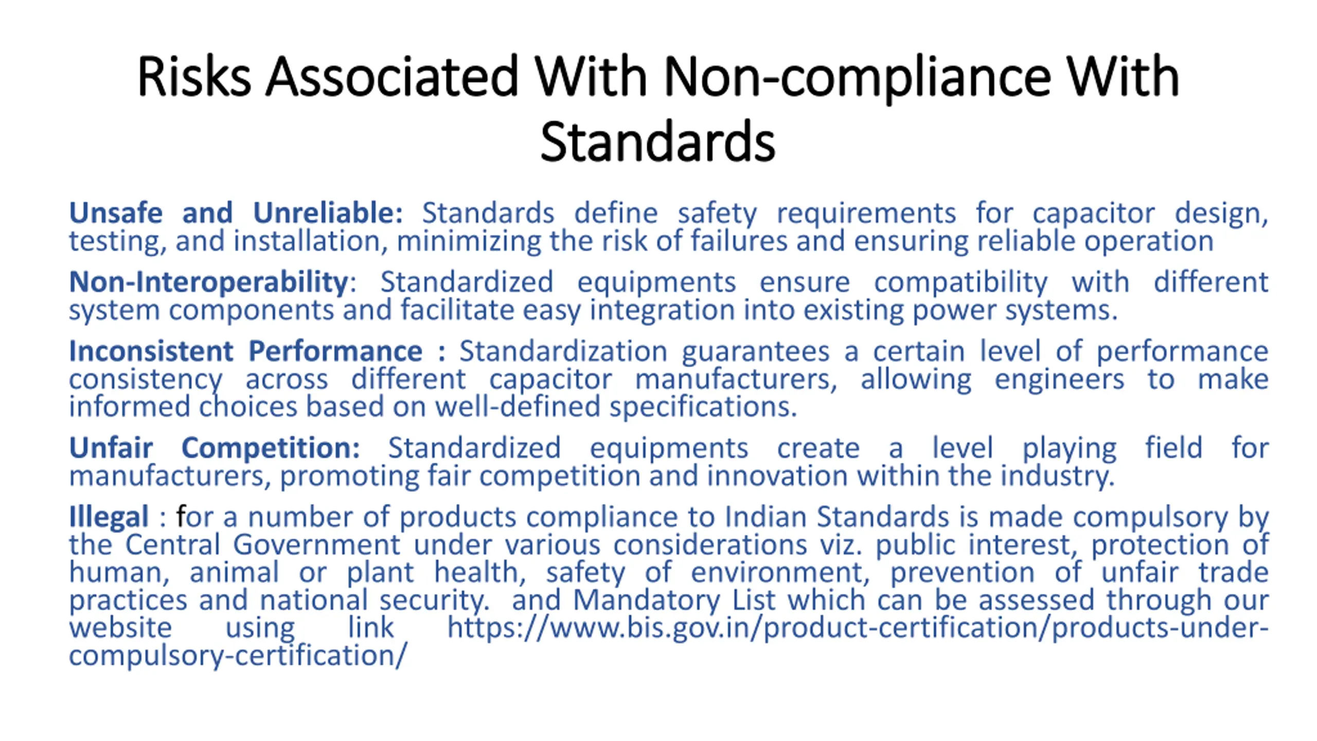 Risks Associated With Non Risks Associated With Non- -compliance With Standards Standards compliance With Unsafe and Unreliable: Standards define safety requirements for capacitor design, testing, and installation, minimizing the risk of failures and ensuring reliable operation Non-Interoperability: Standardized equipments ensure compatibility with different system components and facilitate easy integration into existing power systems. Inconsistent Performance : Standardization guarantees a certain level of performance consistency across different capacitor manufacturers, allowing engineers to make informed choices based on well-defined specifications. Unfair Competition: Standardized equipments create a level playing field for manufacturers, promoting fair competition and innovation within the industry. Illegal : for a number of products compliance to Indian Standards is made compulsory by the Central Government under various considerations viz. public interest, protection of human, animal or plant health, safety of environment, prevention of unfair trade practices and national security. and Mandatory List which can be assessed through our website using link https://www.bis.gov.in/product-certification/products-under- compulsory-certification/
