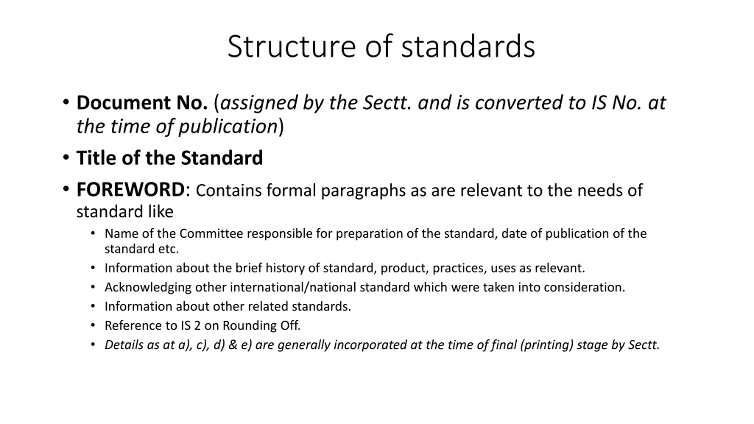 Structure of standards Document No. (assigned by the Sectt. and is converted to IS No. at the time of publication) Title of the Standard FOREWORD: Contains formal paragraphs as are relevant to the needs of standard like Name of the Committee responsible for preparation of the standard, date of publication of the standard etc. Information about the brief history of standard, product, practices, uses as relevant. Acknowledging other international/national standard which were taken into consideration. Information about other related standards. Reference to IS 2 on Rounding Off. Details as at a), c), d) & e) are generally incorporated at the time of final (printing) stage by Sectt.