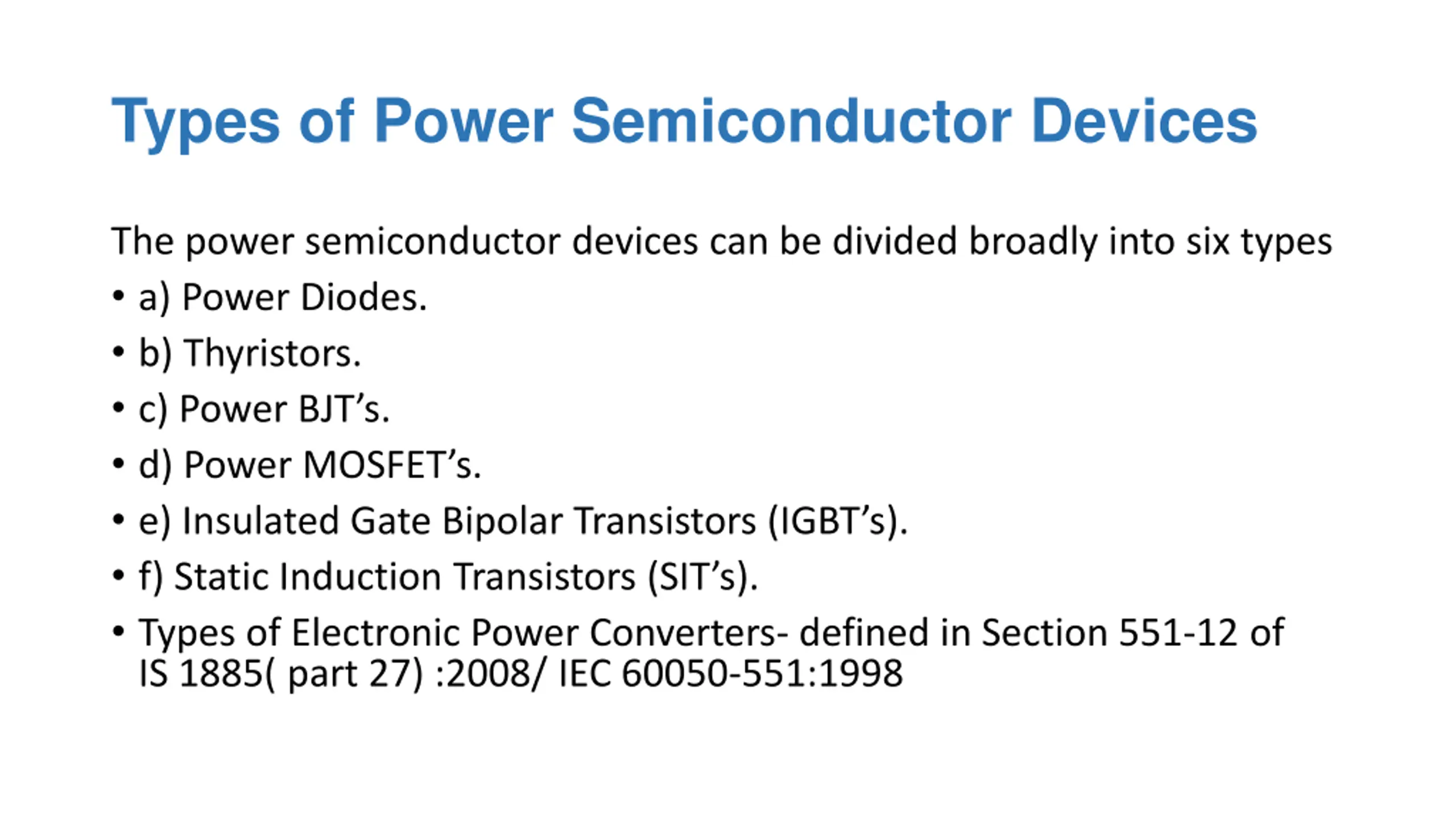 Types of Power Semiconductor Devices The power semiconductor devices can be divided broadly into six types a) Power Diodes. b) Thyristors. c) Power BJT s. d) Power MOSFET s. e) Insulated Gate Bipolar Transistors (IGBT s). f) Static Induction Transistors (SIT s). Types of Electronic Power Converters- defined in Section 551-12 of IS 1885( part 27) :2008/ IEC 60050-551:1998