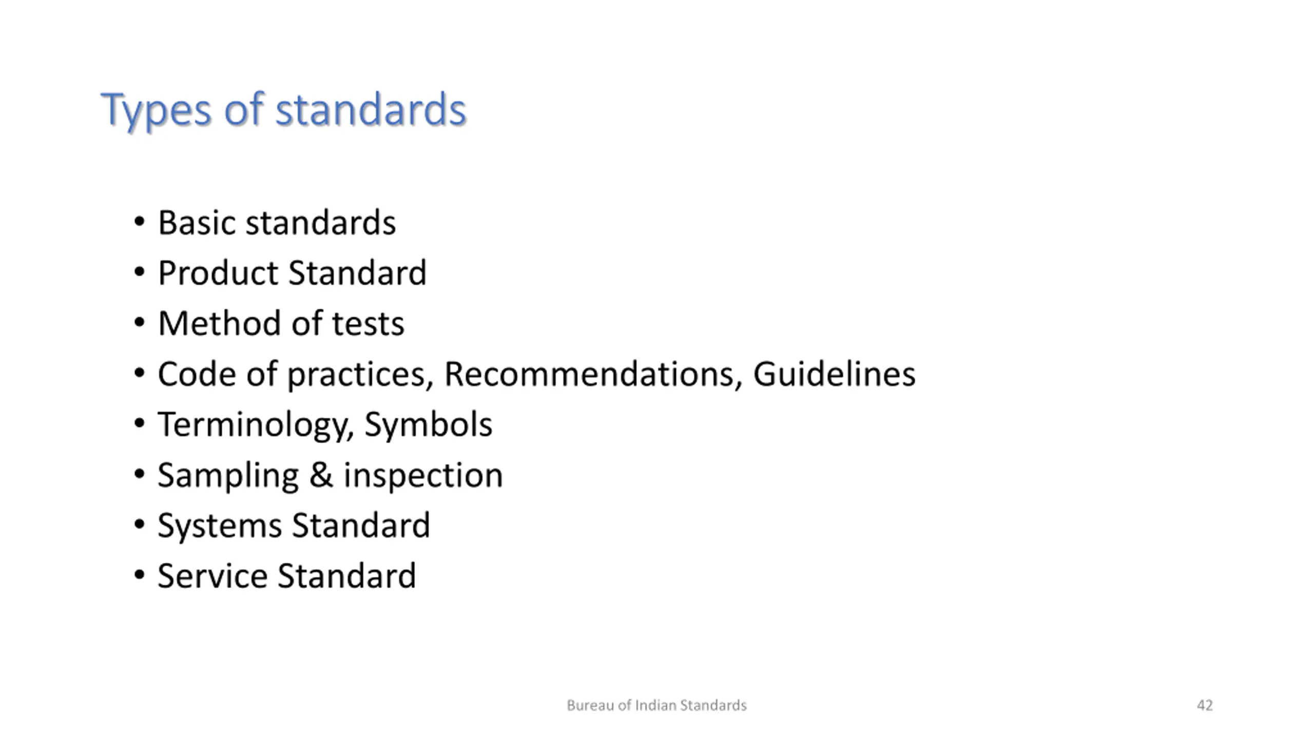 Types of standards Basic standards Product Standard Method of tests Code of practices, Recommendations, Guidelines Terminology, Symbols Sampling & inspection Systems Standard Service Standard Bureau of Indian Standards 42