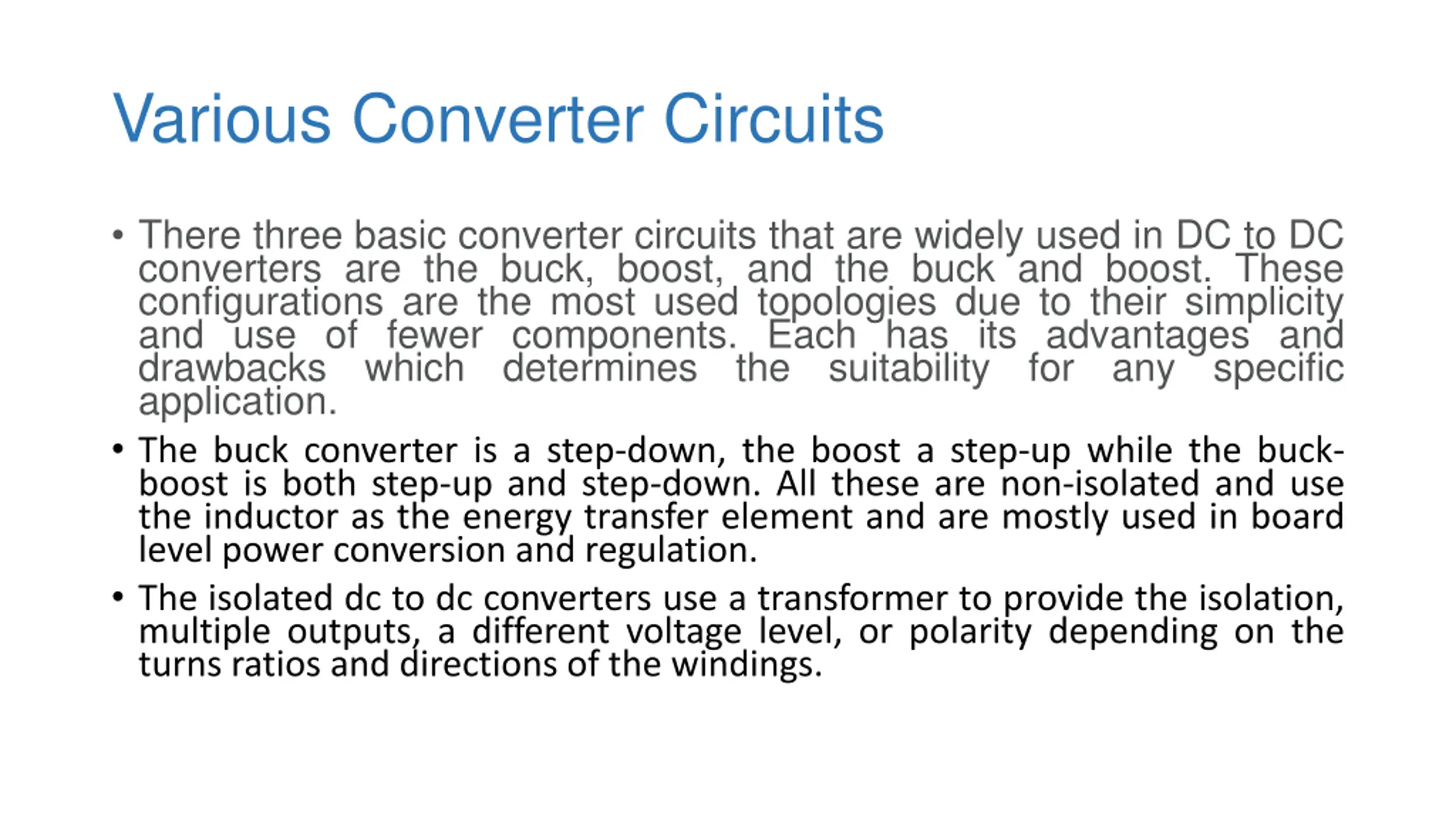 Various Converter Circuits There three basic converter circuits that are widely used in DC to DC converters are the buck, boost, and the buck and boost. These configurations are the most used topologies due to their simplicity and use of fewer components. Each has its advantages and drawbacks which determines the suitability for any specific application. The buck converter is a step-down, the boost a step-up while the buck- boost is both step-up and step-down. All these are non-isolated and use the inductor as the energy transfer element and are mostly used in board level power conversion and regulation. The isolated dc to dc converters use a transformer to provide the isolation, multiple outputs, a different voltage level, or polarity depending on the turns ratios and directions of the windings.