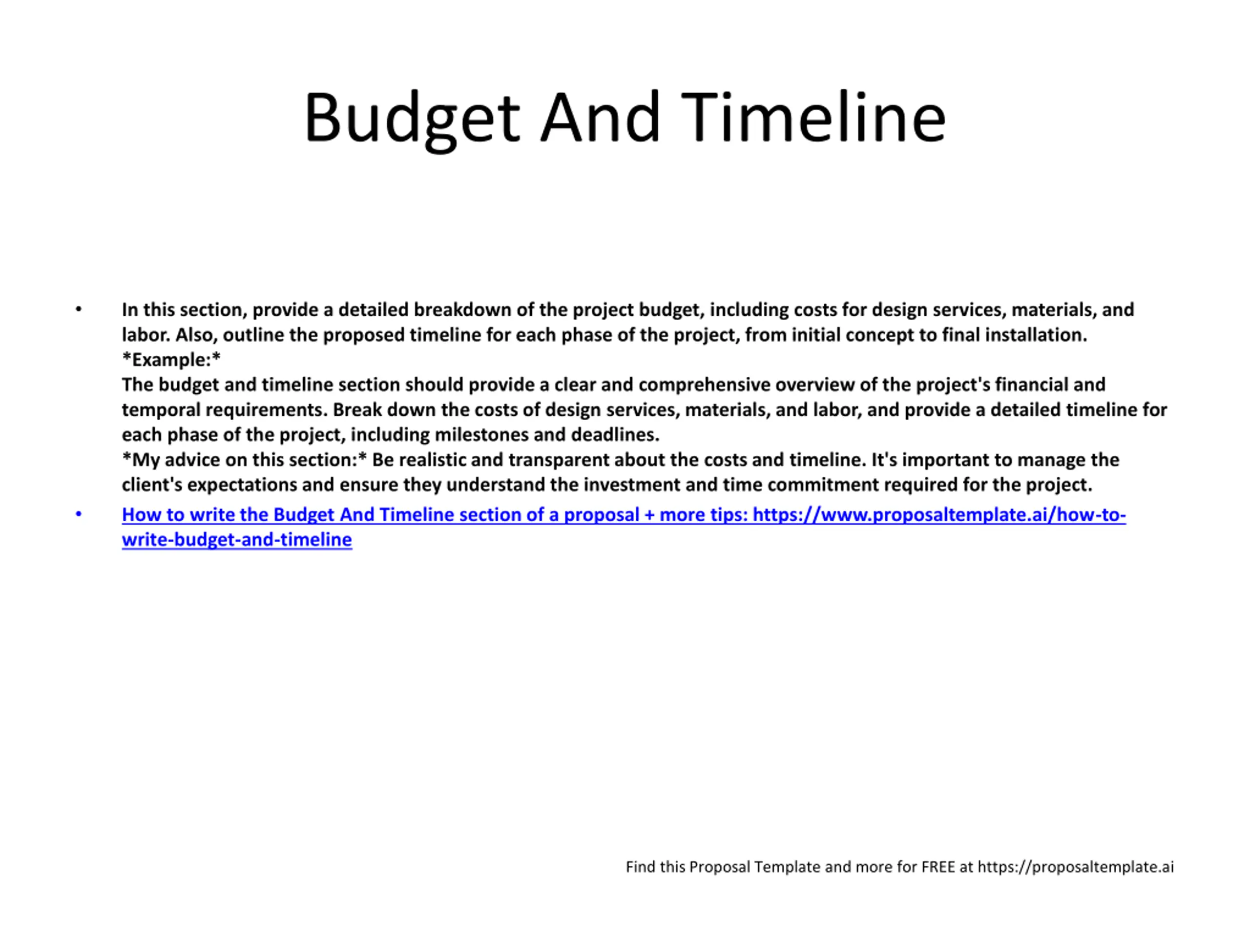 Budget And Timeline In this section, provide a detailed breakdown of the project budget, including costs for design services, materials, and labor. Also, outline the proposed timeline for each phase of the project, from initial concept to final installation. *Example:* The budget and timeline section should provide a clear and comprehensive overview of the project's financial and temporal requirements. Break down the costs of design services, materials, and labor, and provide a detailed timeline for each phase of the project, including milestones and deadlines. *My advice on this section:* Be realistic and transparent about the costs and timeline. It's important to manage the client's expectations and ensure they understand the investment and time commitment required for the project. How to write the Budget And Timeline section of a proposal + more tips: https://www.proposaltemplate.ai/how-to- write-budget-and-timeline Find this Proposal Template and more for FREE at https://proposaltemplate.ai