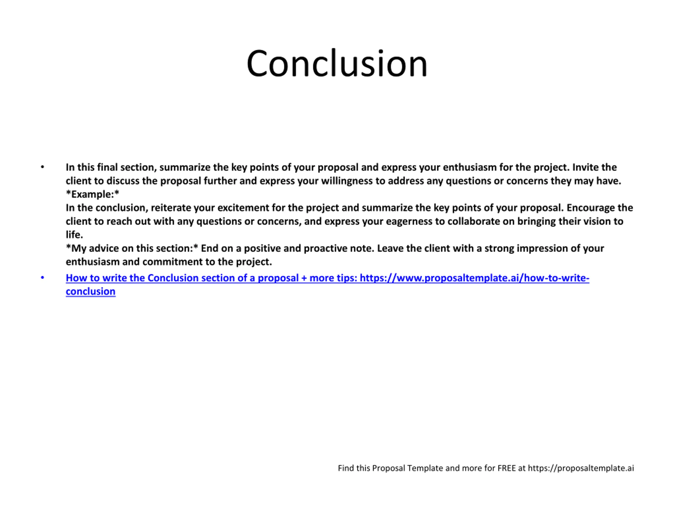Conclusion In this final section, summarize the key points of your proposal and express your enthusiasm for the project. Invite the client to discuss the proposal further and express your willingness to address any questions or concerns they may have. *Example:* In the conclusion, reiterate your excitement for the project and summarize the key points of your proposal. Encourage the client to reach out with any questions or concerns, and express your eagerness to collaborate on bringing their vision to life. *My advice on this section:* End on a positive and proactive note. Leave the client with a strong impression of your enthusiasm and commitment to the project. How to write the Conclusion section of a proposal + more tips: https://www.proposaltemplate.ai/how-to-write- conclusion Find this Proposal Template and more for FREE at https://proposaltemplate.ai