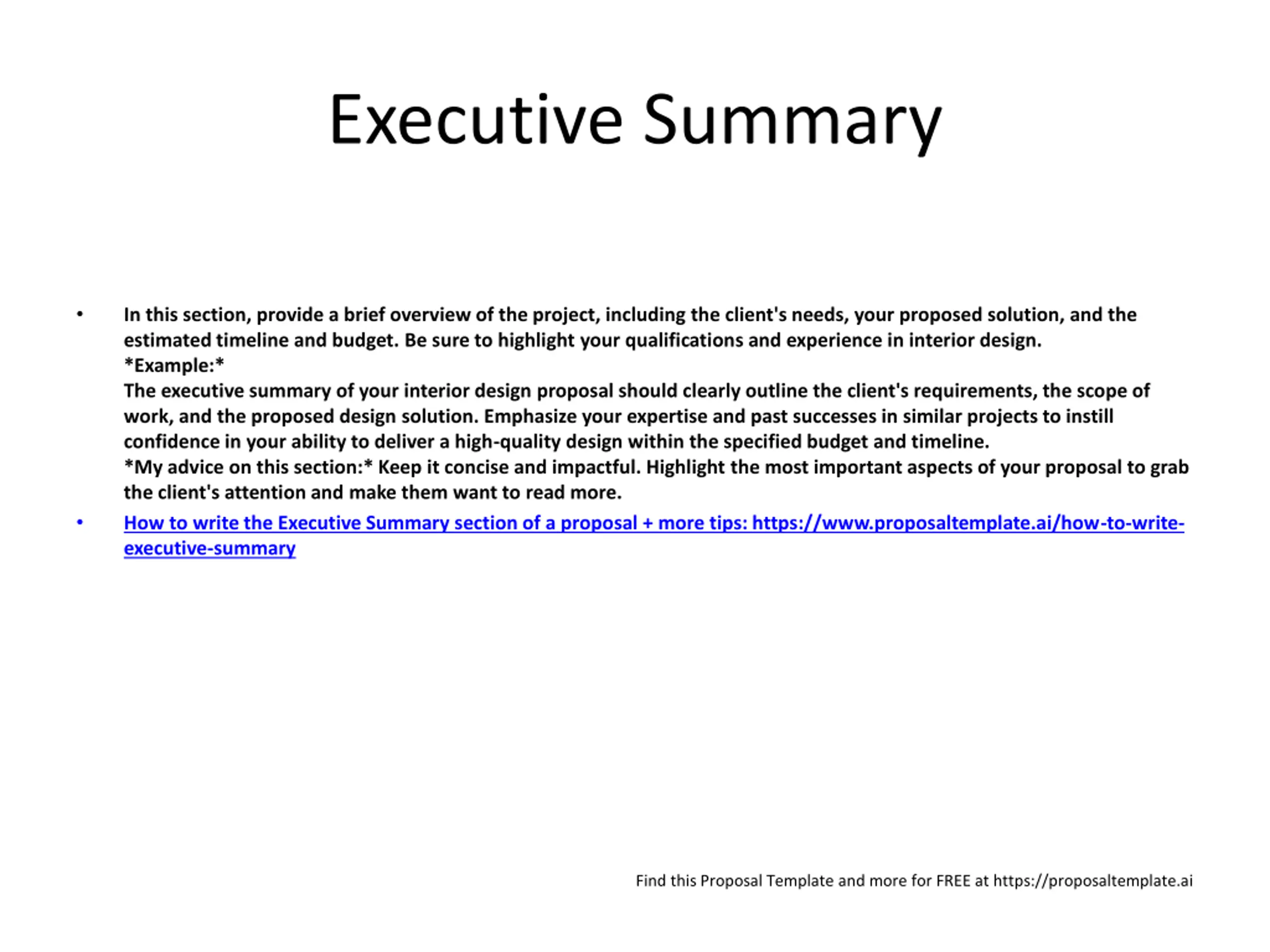 Executive Summary In this section, provide a brief overview of the project, including the client's needs, your proposed solution, and the estimated timeline and budget. Be sure to highlight your qualifications and experience in interior design. *Example:* The executive summary of your interior design proposal should clearly outline the client's requirements, the scope of work, and the proposed design solution. Emphasize your expertise and past successes in similar projects to instill confidence in your ability to deliver a high-quality design within the specified budget and timeline. *My advice on this section:* Keep it concise and impactful. Highlight the most important aspects of your proposal to grab the client's attention and make them want to read more. How to write the Executive Summary section of a proposal + more tips: https://www.proposaltemplate.ai/how-to-write- executive-summary Find this Proposal Template and more for FREE at https://proposaltemplate.ai