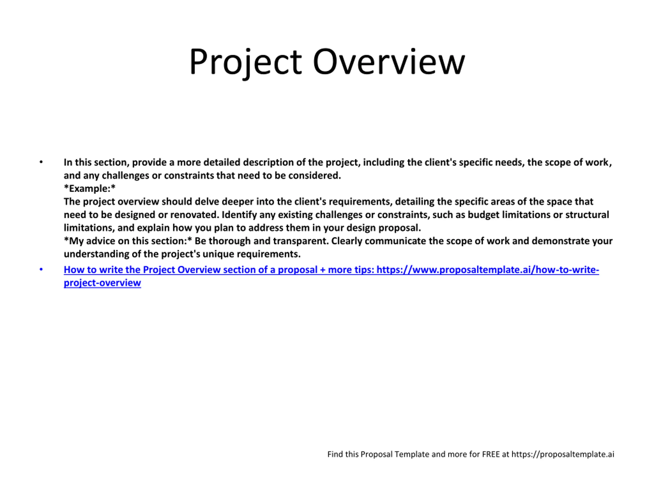 Project Overview In this section, provide a more detailed description of the project, including the client's specific needs, the scope of work, and any challenges or constraints that need to be considered. *Example:* The project overview should delve deeper into the client's requirements, detailing the specific areas of the space that need to be designed or renovated. Identify any existing challenges or constraints, such as budget limitations or structural limitations, and explain how you plan to address them in your design proposal. *My advice on this section:* Be thorough and transparent. Clearly communicate the scope of work and demonstrate your understanding of the project's unique requirements. How to write the Project Overview section of a proposal + more tips: https://www.proposaltemplate.ai/how-to-write- project-overview Find this Proposal Template and more for FREE at https://proposaltemplate.ai