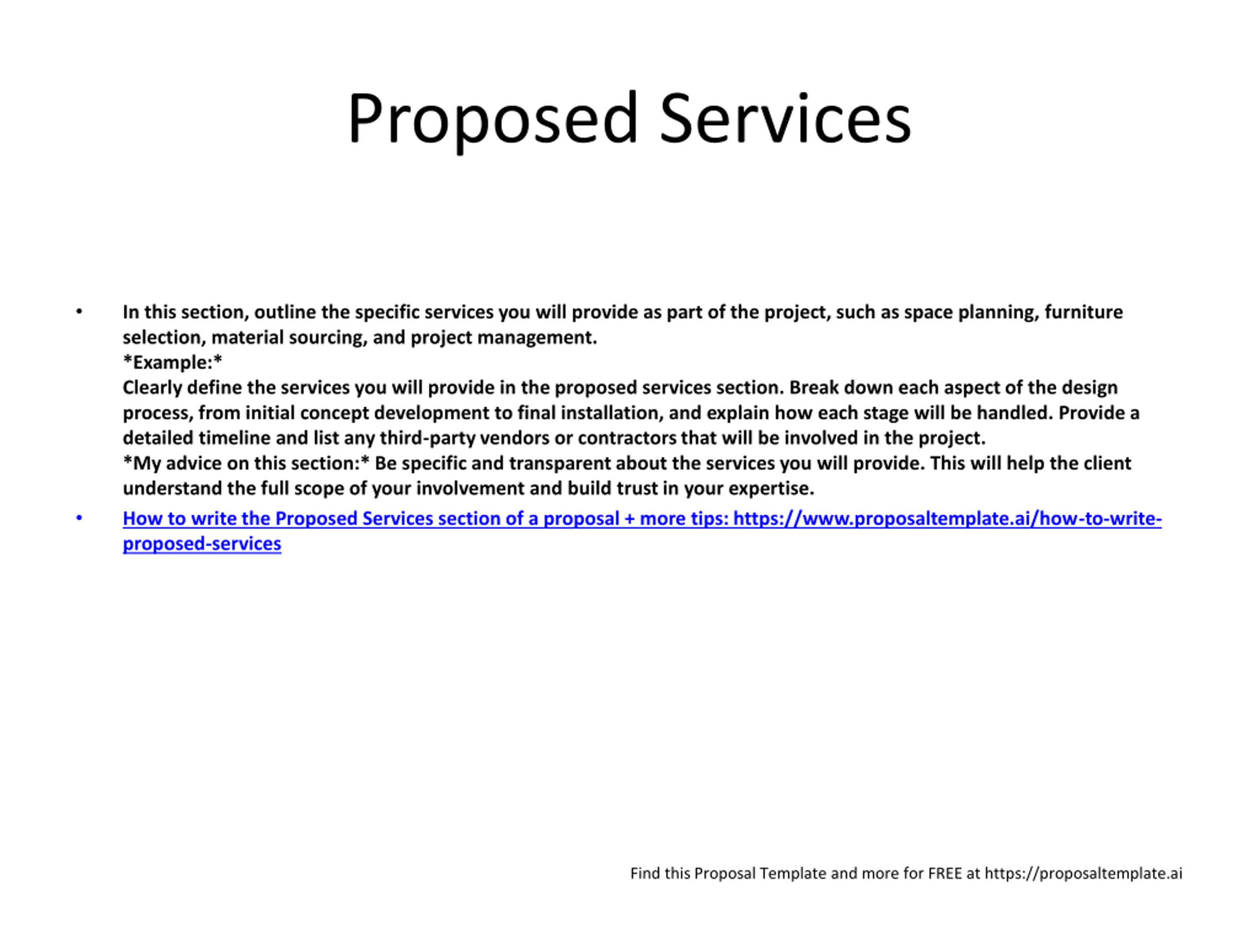 Proposed Services In this section, outline the specific services you will provide as part of the project, such as space planning, furniture selection, material sourcing, and project management. *Example:* Clearly define the services you will provide in the proposed services section. Break down each aspect of the design process, from initial concept development to final installation, and explain how each stage will be handled. Provide a detailed timeline and list any third-party vendors or contractors that will be involved in the project. *My advice on this section:* Be specific and transparent about the services you will provide. This will help the client understand the full scope of your involvement and build trust in your expertise. How to write the Proposed Services section of a proposal + more tips: https://www.proposaltemplate.ai/how-to-write- proposed-services Find this Proposal Template and more for FREE at https://proposaltemplate.ai