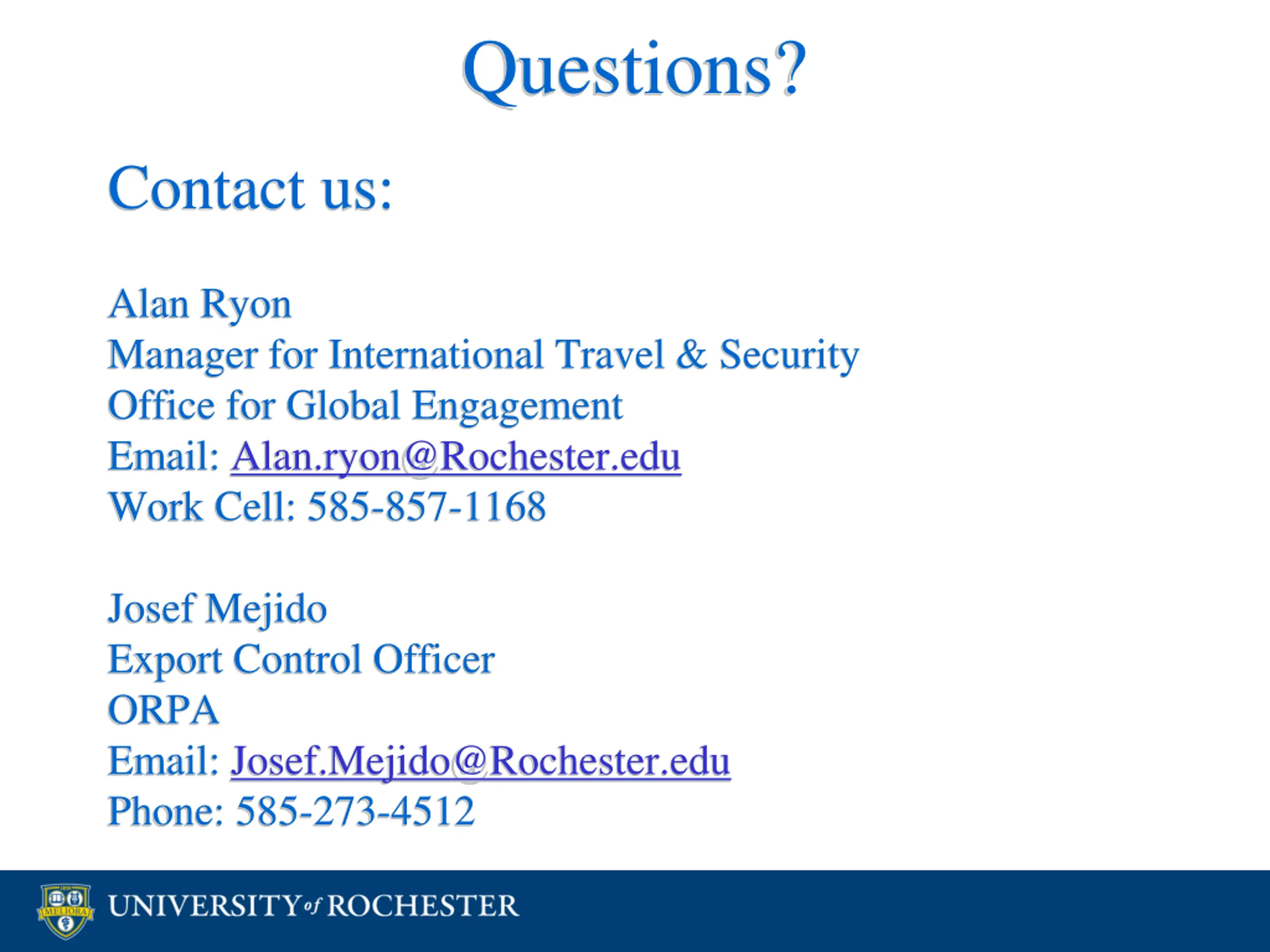 Questions? Contact us: Alan Ryon Manager for International Travel & Security Office for Global Engagement Email: Alan.ryon@Rochester.edu Work Cell: 585-857-1168 Josef Mejido Export Control Officer ORPA Email: Josef.Mejido@Rochester.edu Phone: 585-273-4512