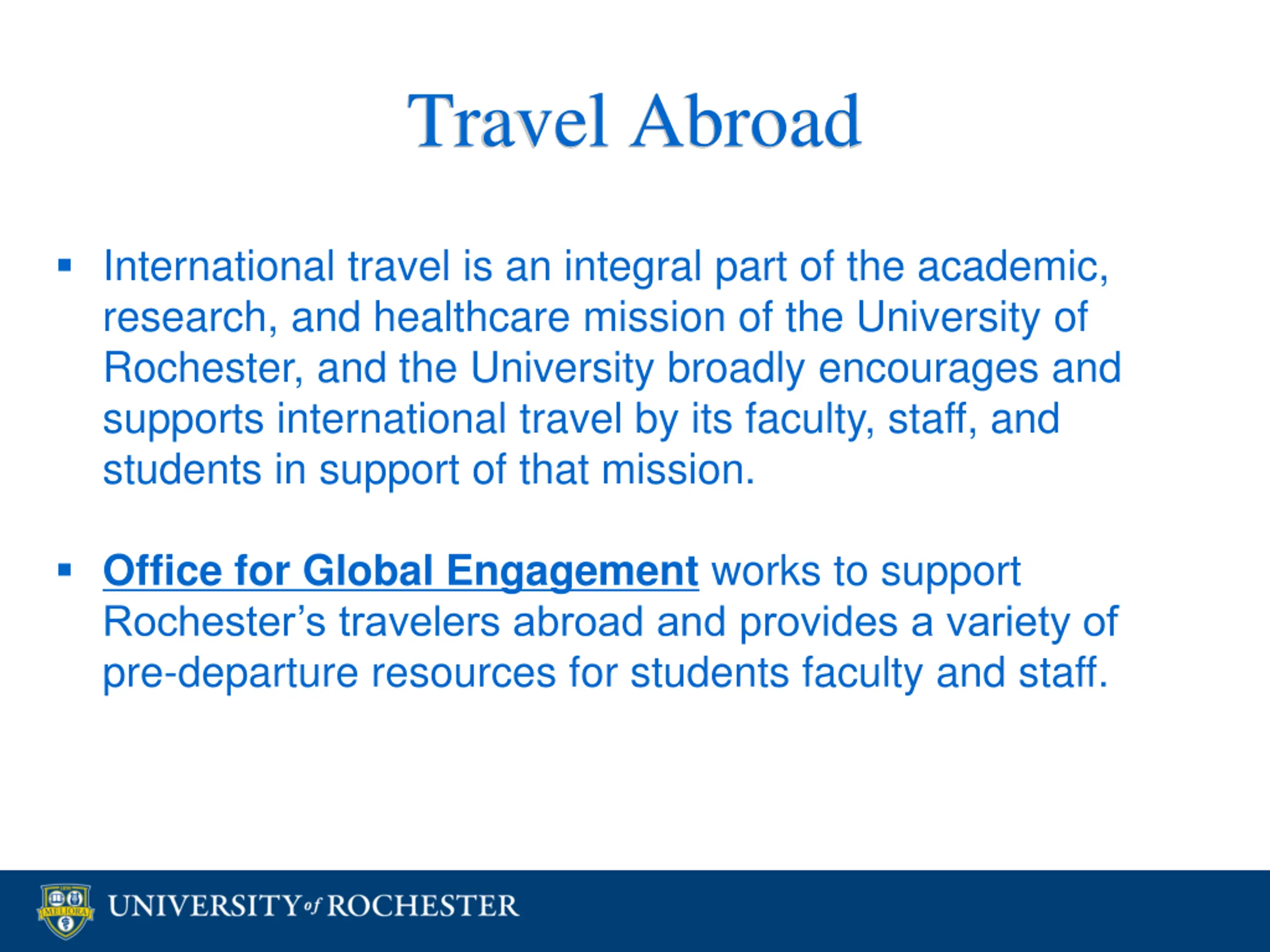 Travel Abroad International travel is an integral part of the academic, research, and healthcare mission of the University of Rochester, and the University broadly encourages and supports international travel by its faculty, staff, and students in support of that mission. Office for Global Engagement works to support Rochester s travelers abroad and provides a variety of pre-departure resources for students faculty and staff.