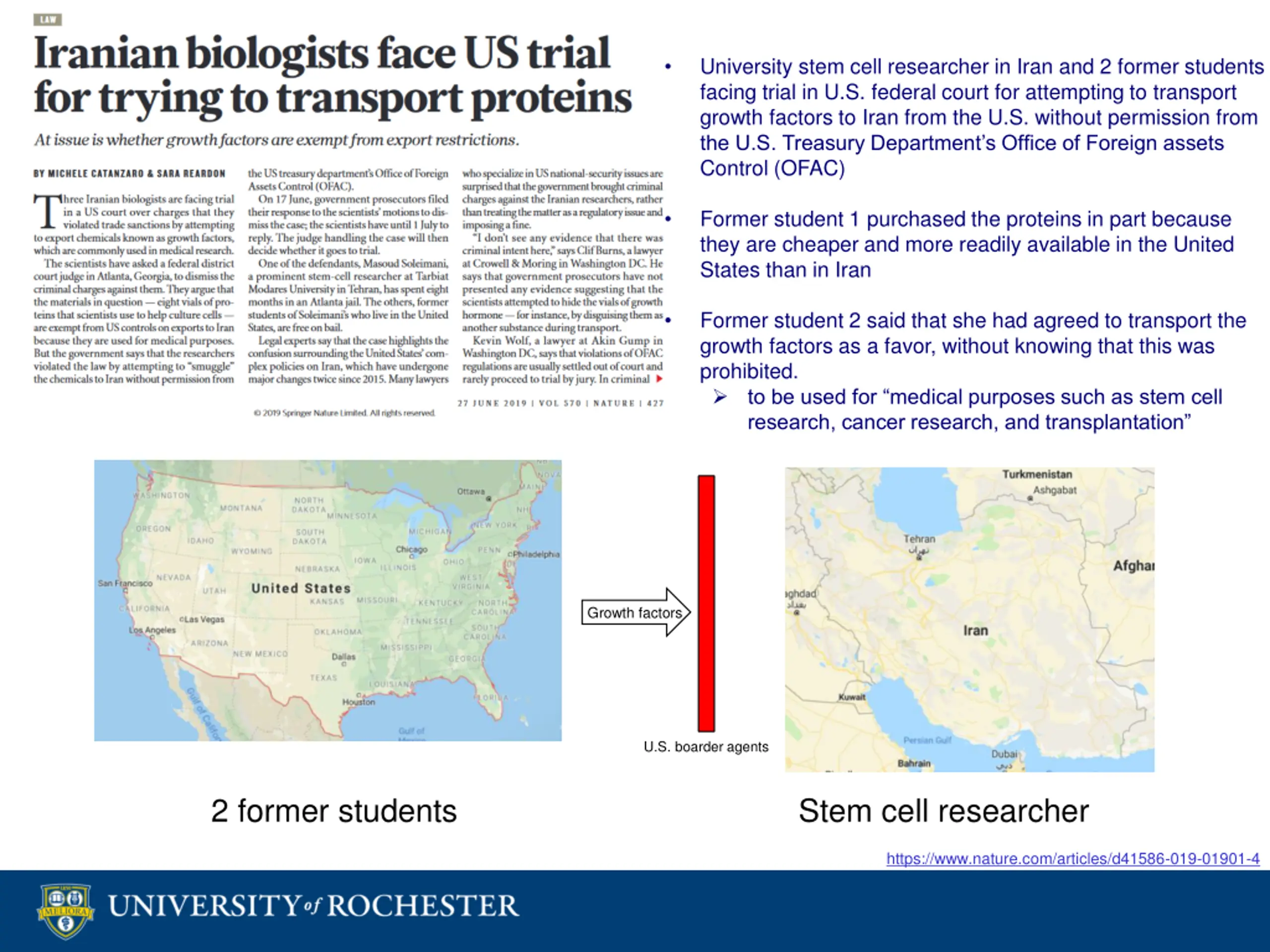 University stem cell researcher in Iran and 2 former students facing trial in U.S. federal court for attempting to transport growth factors to Iran from the U.S. without permission from the U.S. Treasury Department s Office of Foreign assets Control (OFAC) Former student 1 purchased the proteins in part because they are cheaper and more readily available in the United States than in Iran Former student 2 said that she had agreed to transport the growth factors as a favor, without knowing that this was prohibited. to be used for medical purposes such as stem cell research, cancer research, and transplantation Growth factors U.S. boarder agents 2 former students Stem cell researcher https://www.nature.com/articles/d41586-019-01901-4
