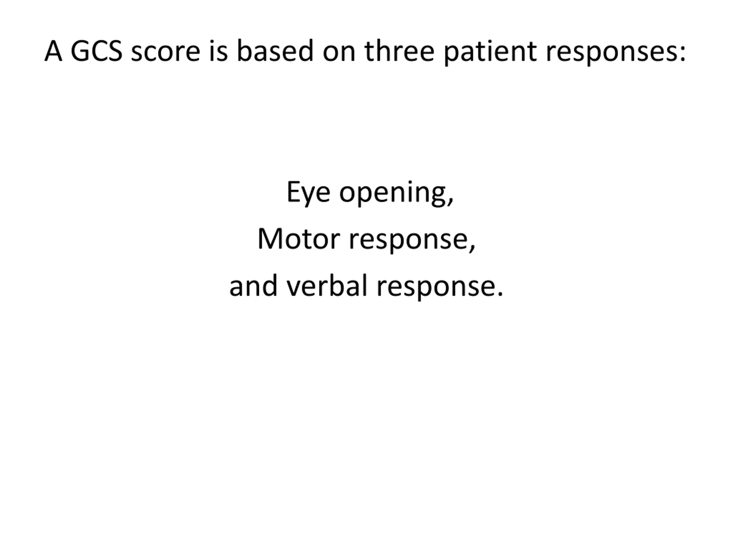 A GCS score is based on three patient responses: Eye opening, Motor response, and verbal response.