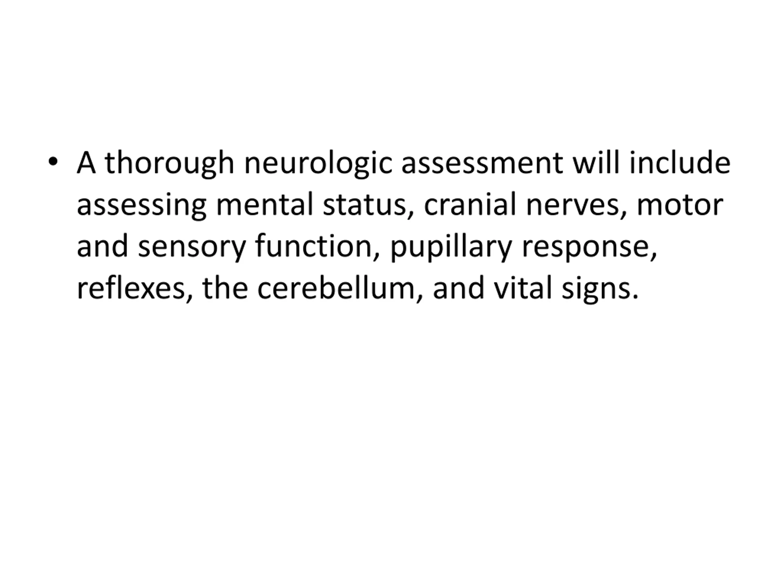 A thorough neurologic assessment will include assessing mental status, cranial nerves, motor and sensory function, pupillary response, reflexes, the cerebellum, and vital signs.