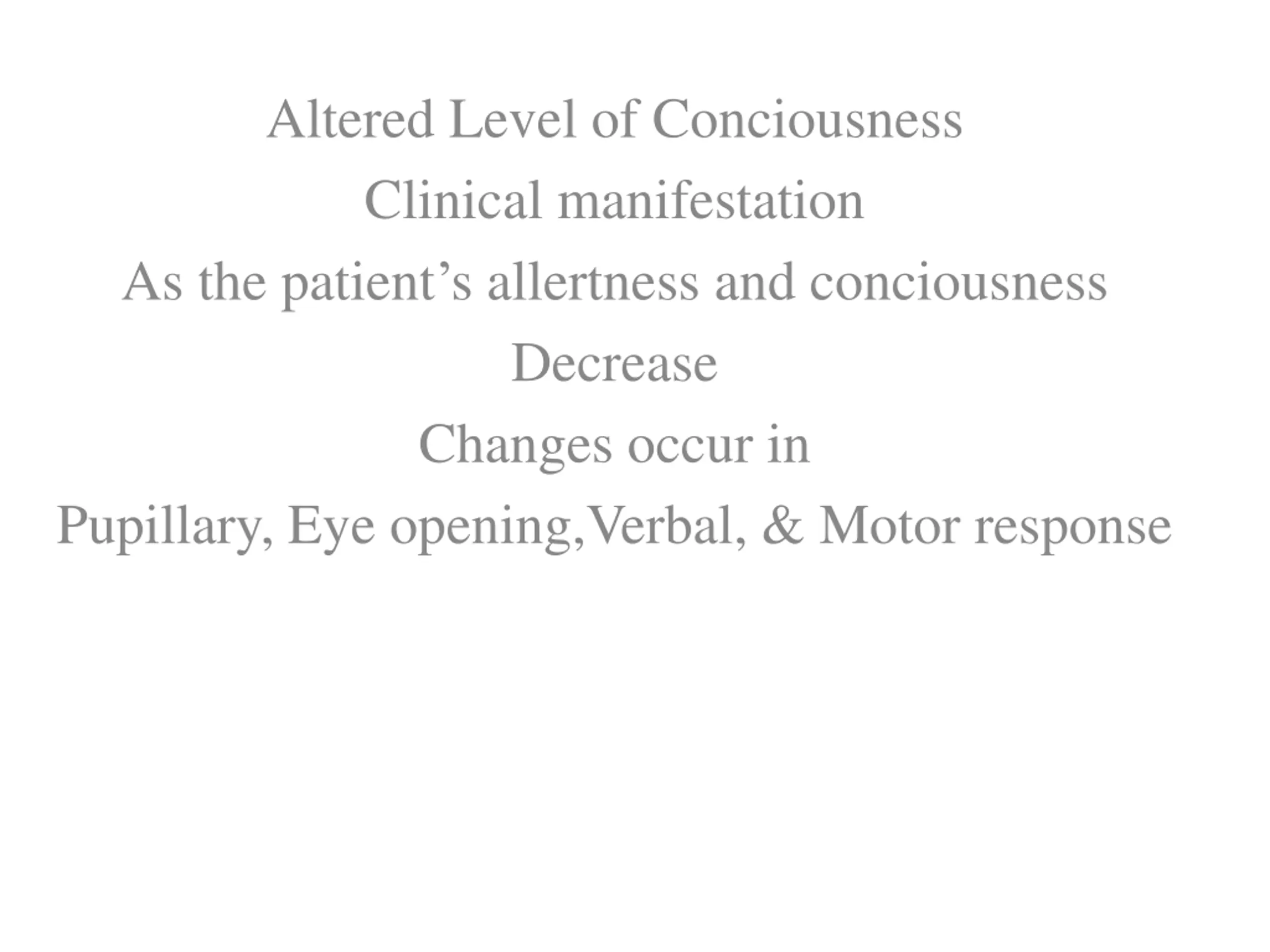 Altered Level of Conciousness Clinical manifestation As the patient s allertness and conciousness Decrease Changes occur in Pupillary, Eye opening,Verbal, & Motor response