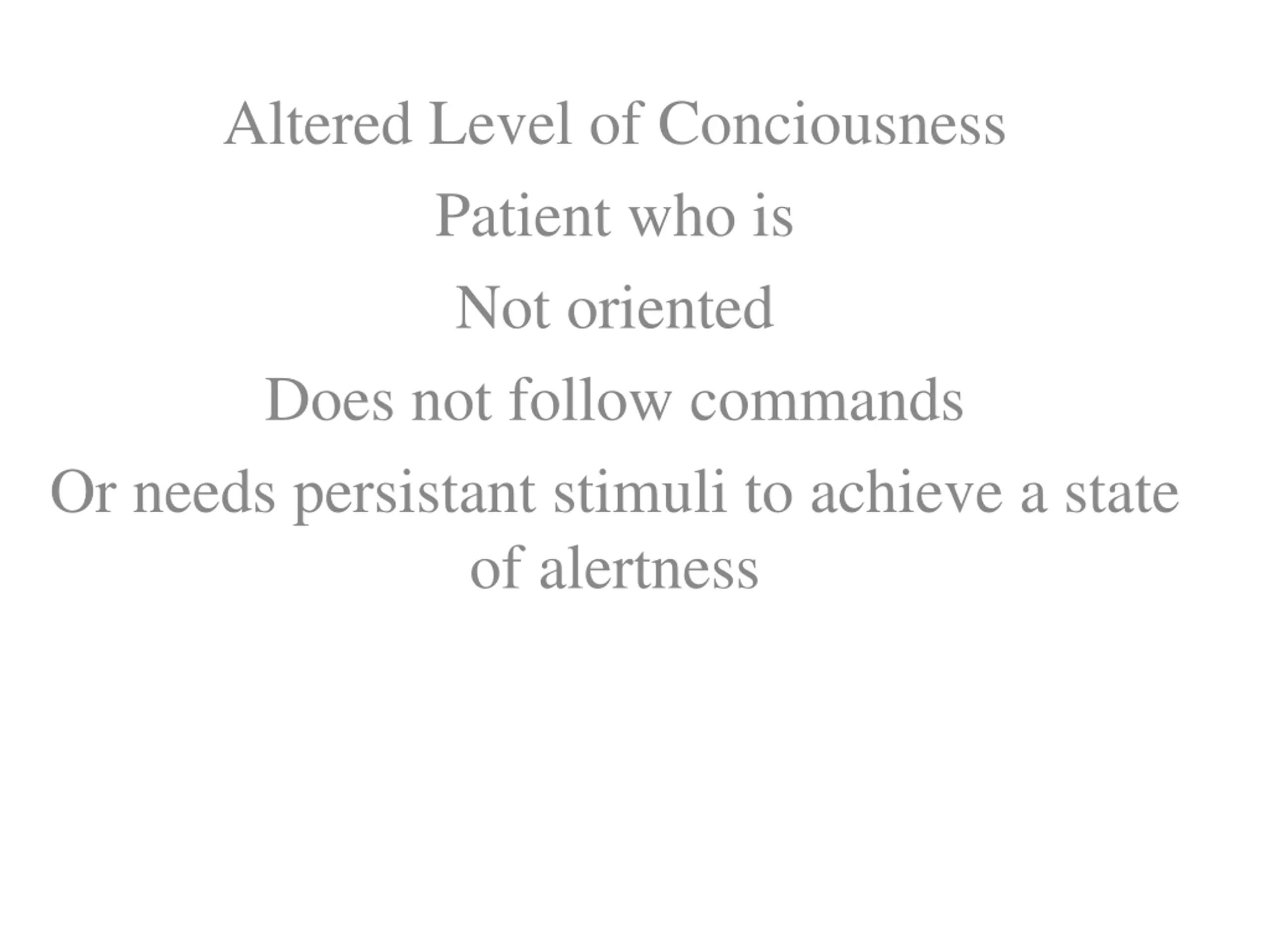 Altered Level of Conciousness Patient who is Not oriented Does not follow commands Or needs persistant stimuli to achieve a state of alertness