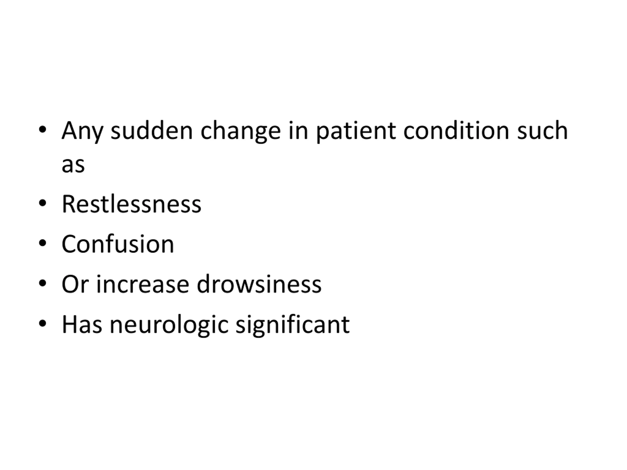 Any sudden change in patient condition such as Restlessness Confusion Or increase drowsiness Has neurologic significant