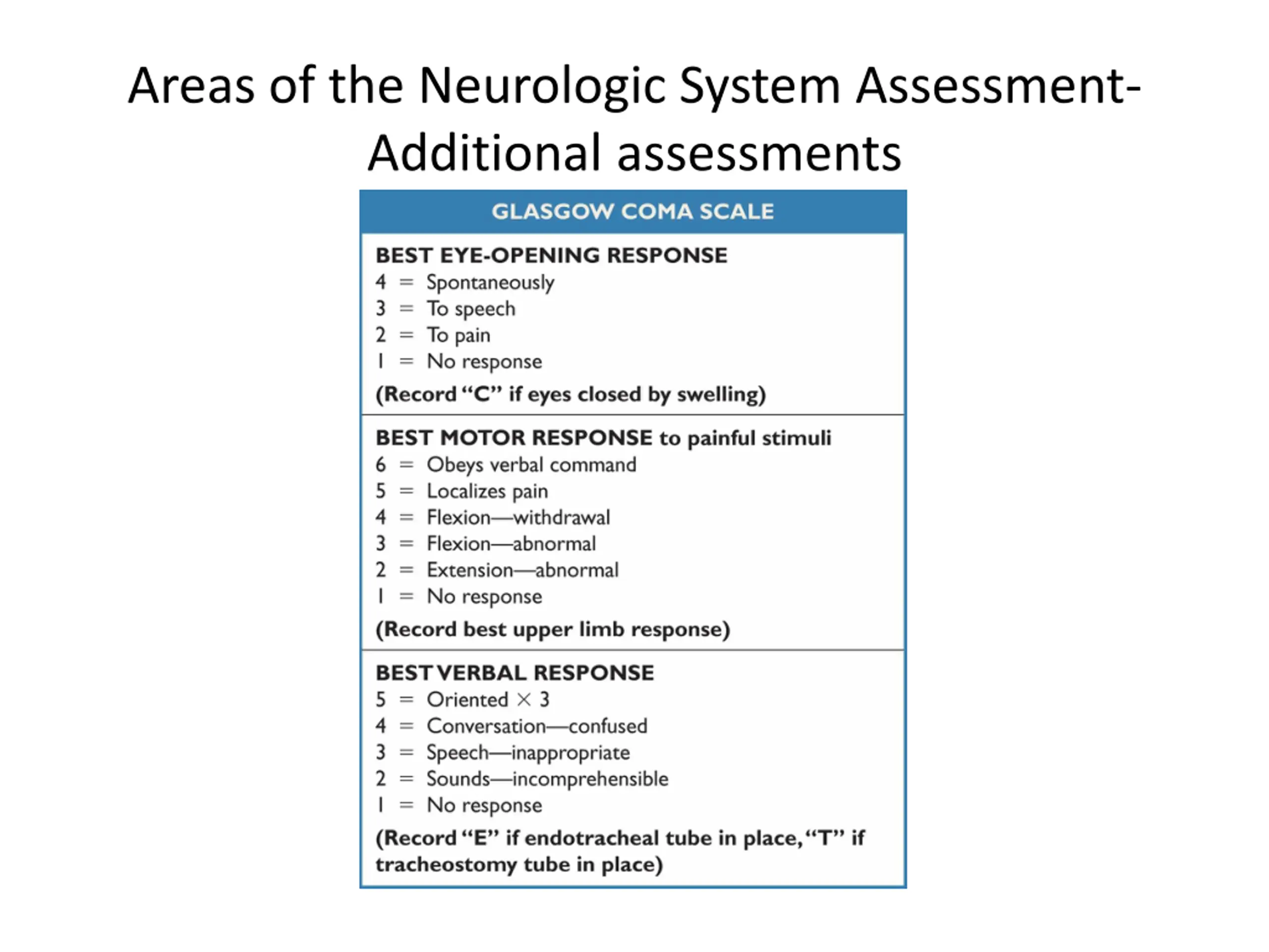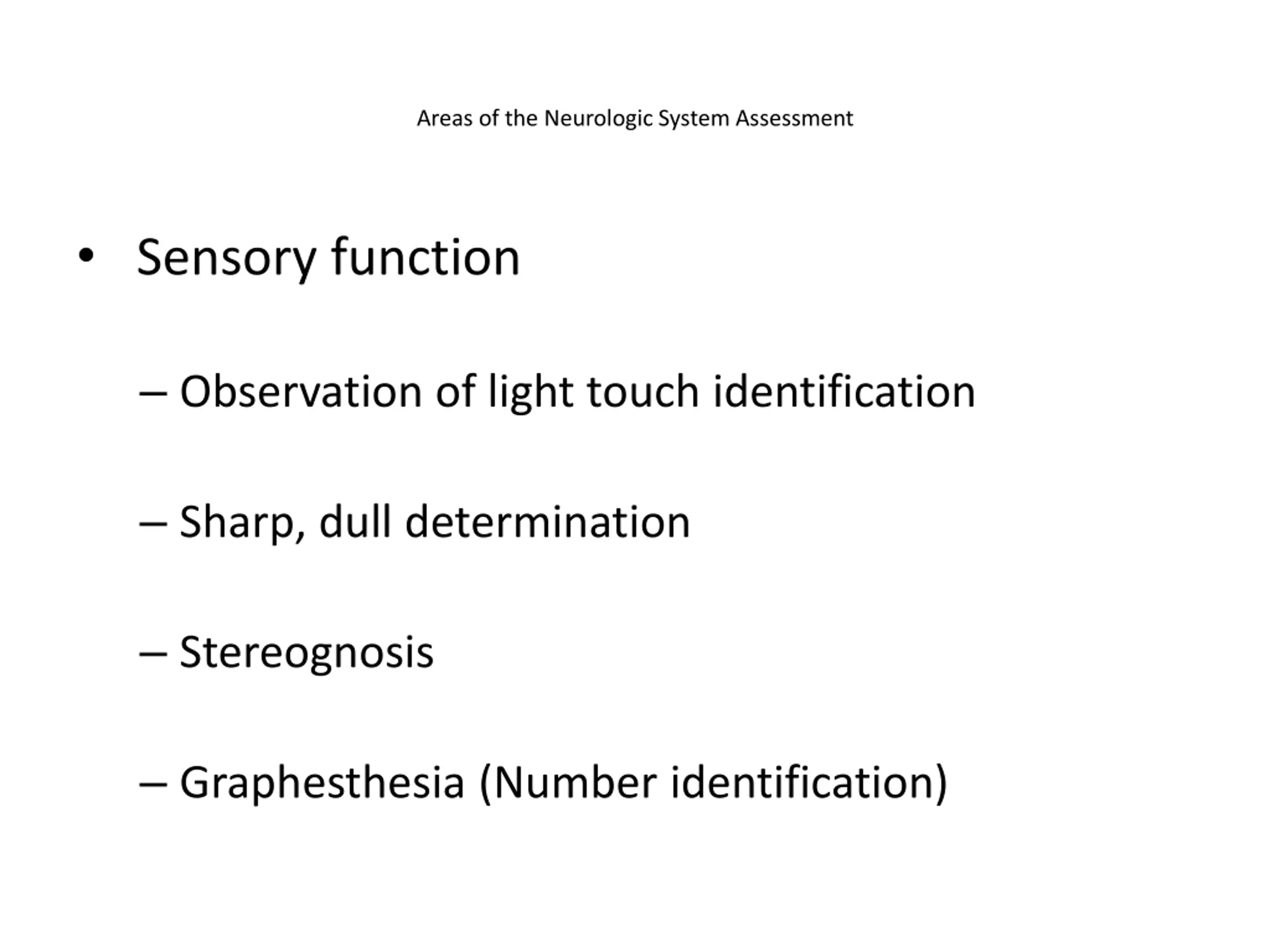 Areas of the Neurologic System Assessment Sensory function Observation of light touch identification Sharp, dull determination Stereognosis Graphesthesia (Number identification)