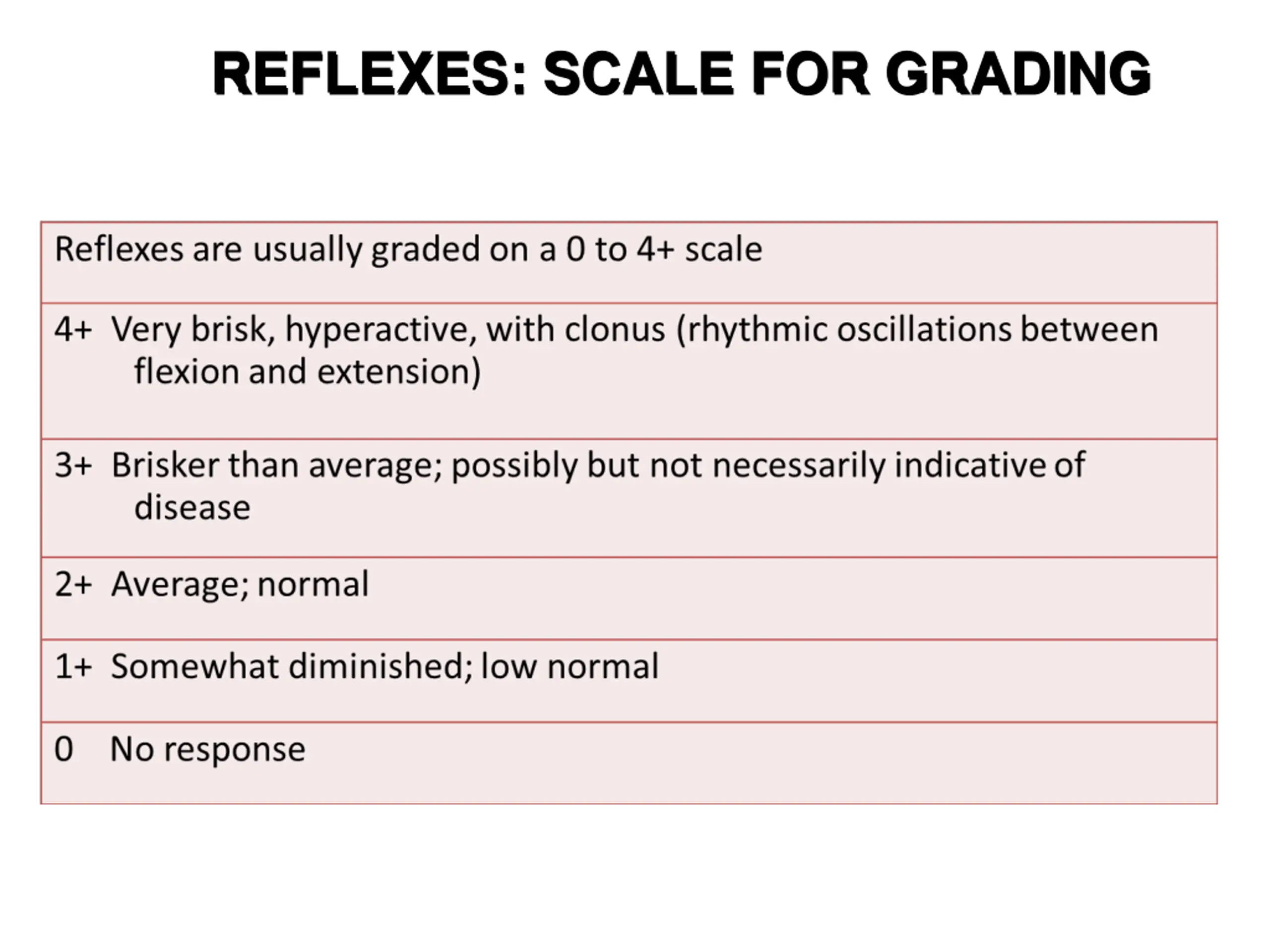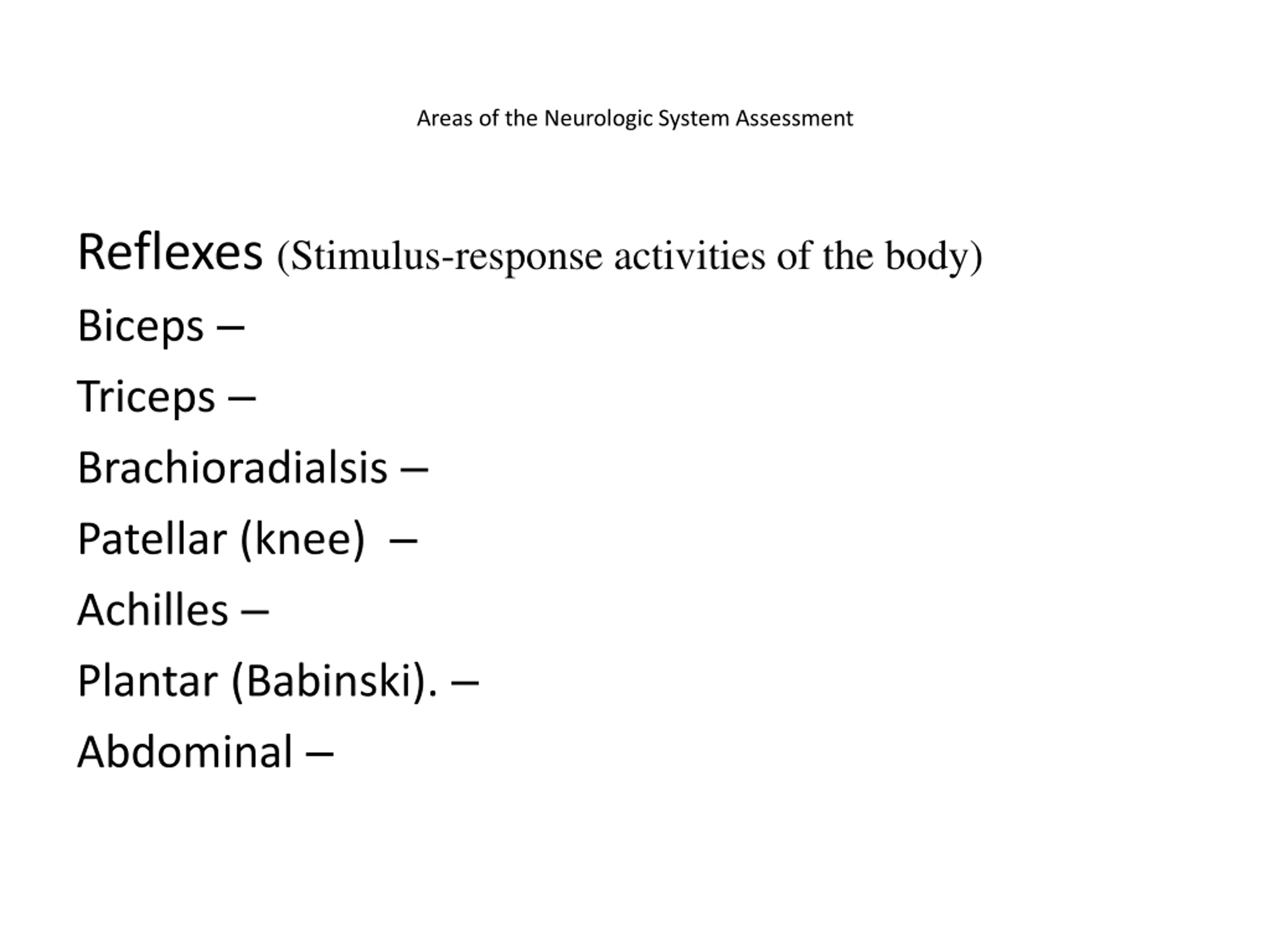 Areas of the Neurologic System Assessment Reflexes (Stimulus-response activities of the body) Biceps Triceps Brachioradialsis Patellar (knee) Achilles Plantar (Babinski). Abdominal