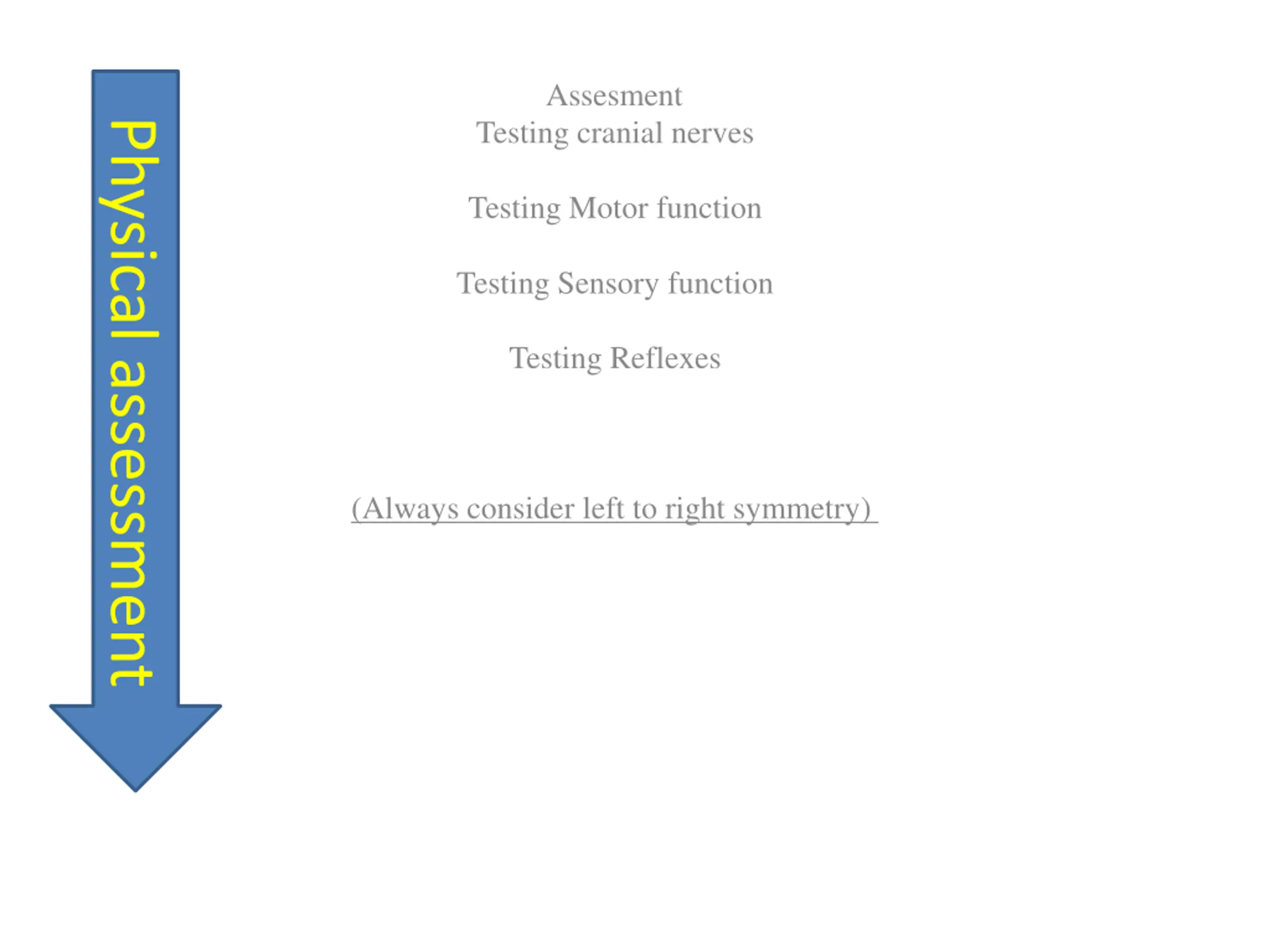 Assesment Testing cranial nerves Testing Motor function Testing Sensory function Testing Reflexes (Always consider left to right symmetry)
