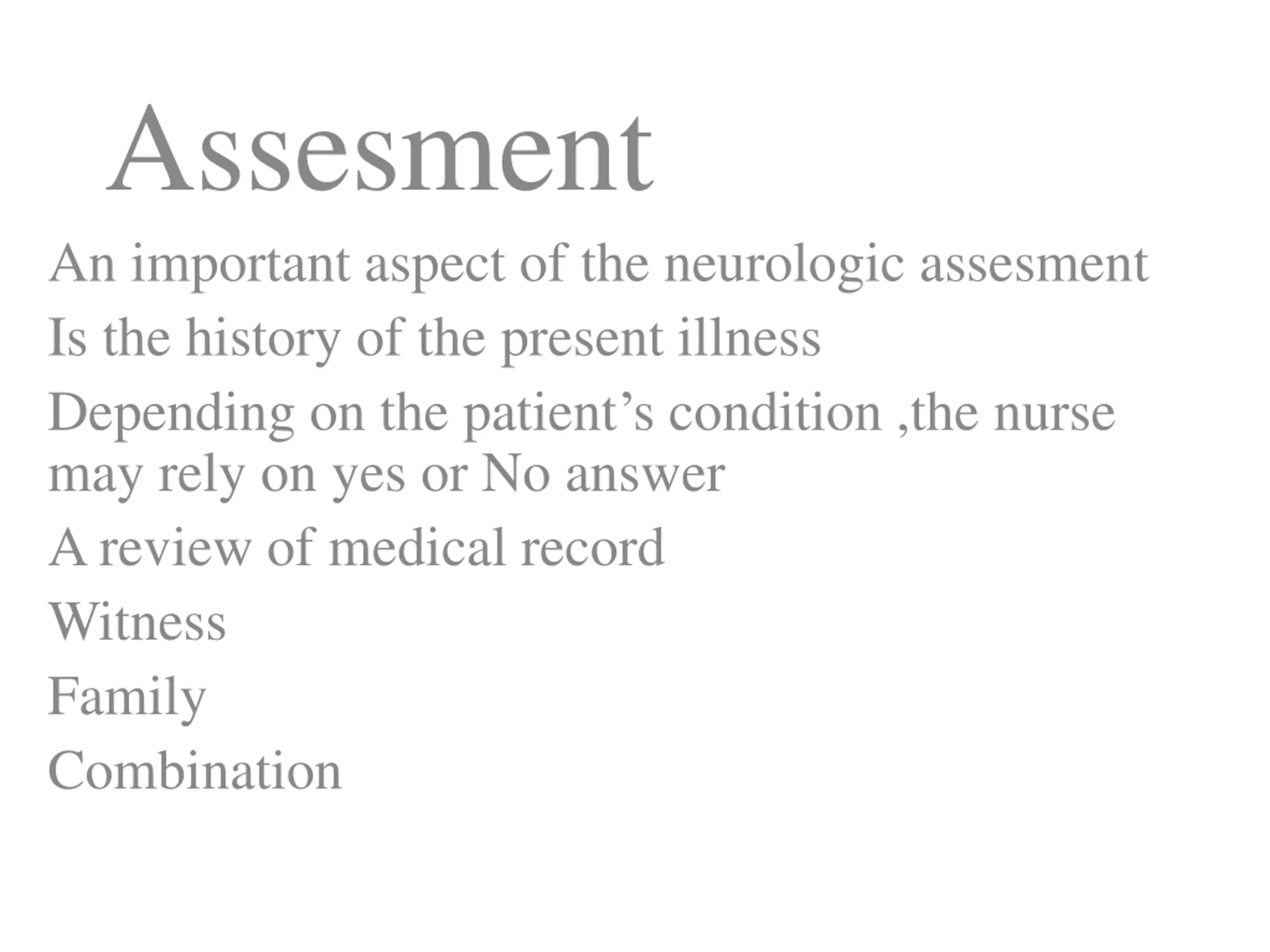 Assesment An important aspect of the neurologic assesment Is the history of the present illness Depending on the patient s condition ,the nurse may rely on yes or No answer A review of medical record Witness Family Combination
