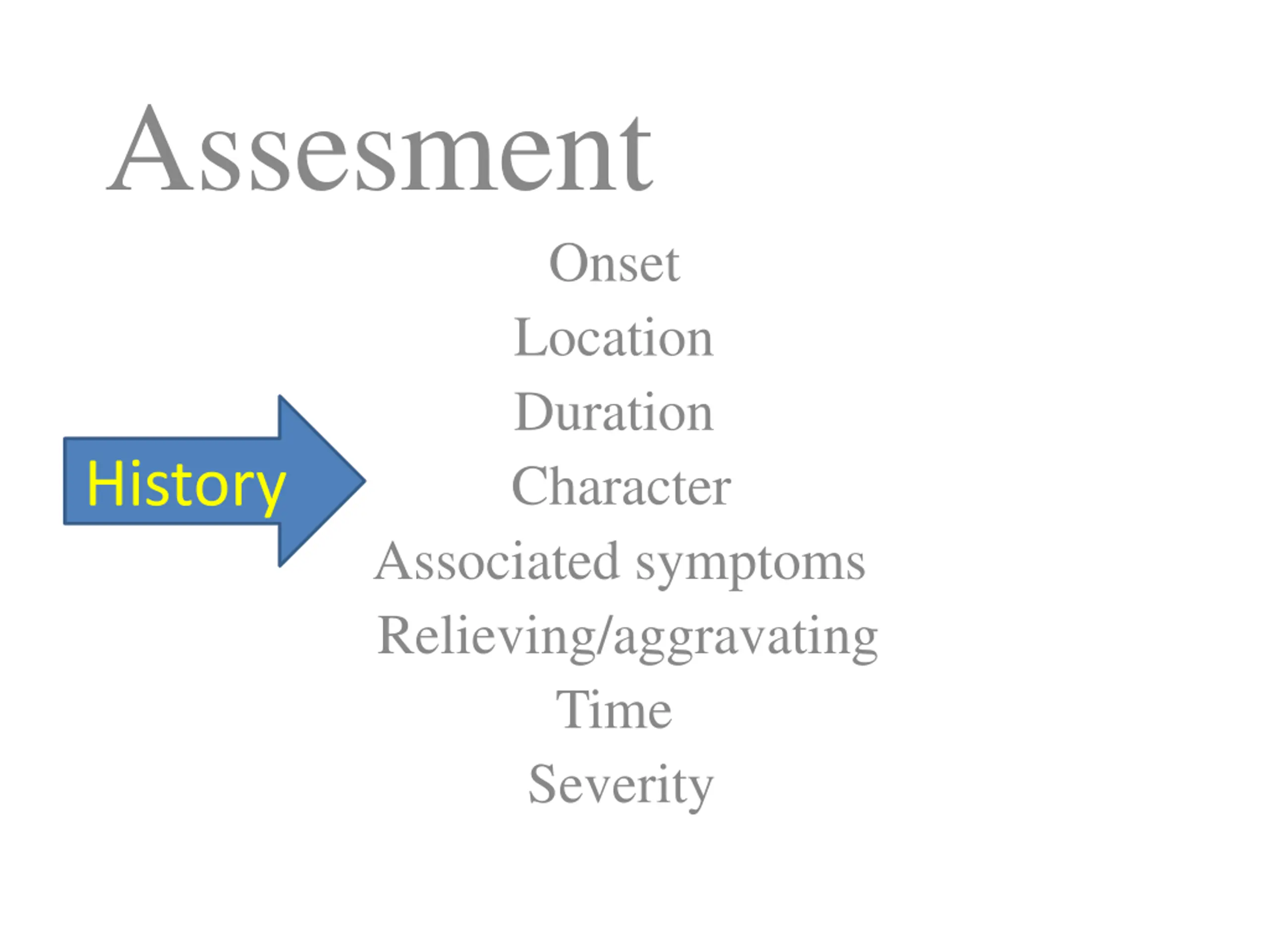 Assesment Onset Location Duration Character History Associated symptoms Relieving/aggravating Time Severity