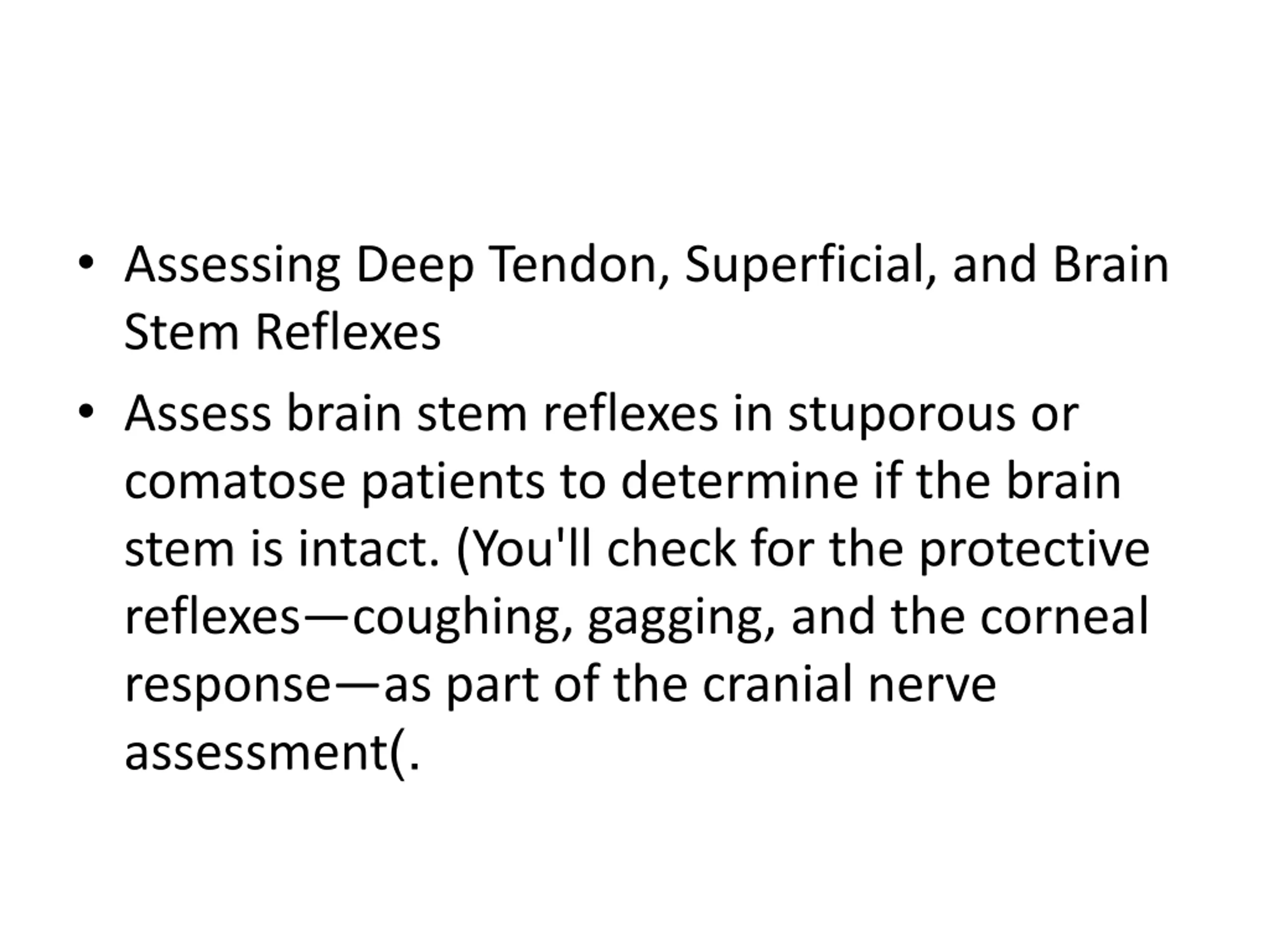 Assessing Deep Tendon, Superficial, and Brain Stem Reflexes Assess brain stem reflexes in stuporous or comatose patients to determine if the brain stem is intact. (You'll check for the protective reflexes coughing, gagging, and the corneal response as part of the cranial nerve assessment).