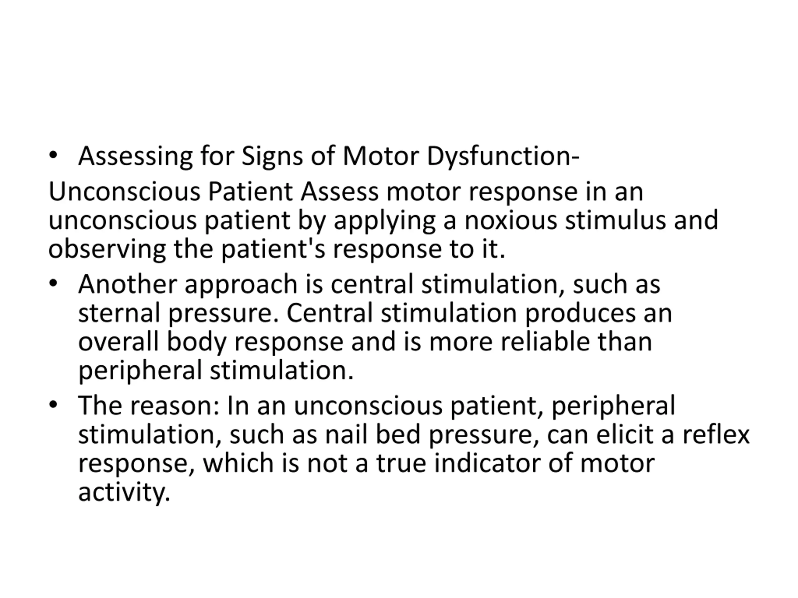 Assessing for Signs of Motor Dysfunction- Unconscious Patient Assess motor response in an unconscious patient by applying a noxious stimulus and observing the patient's response to it. Another approach is central stimulation, such as sternal pressure. Central stimulation produces an overall body response and is more reliable than peripheral stimulation. The reason: In an unconscious patient, peripheral stimulation, such as nail bed pressure, can elicit a reflex response, which is not a true indicator of motor activity.