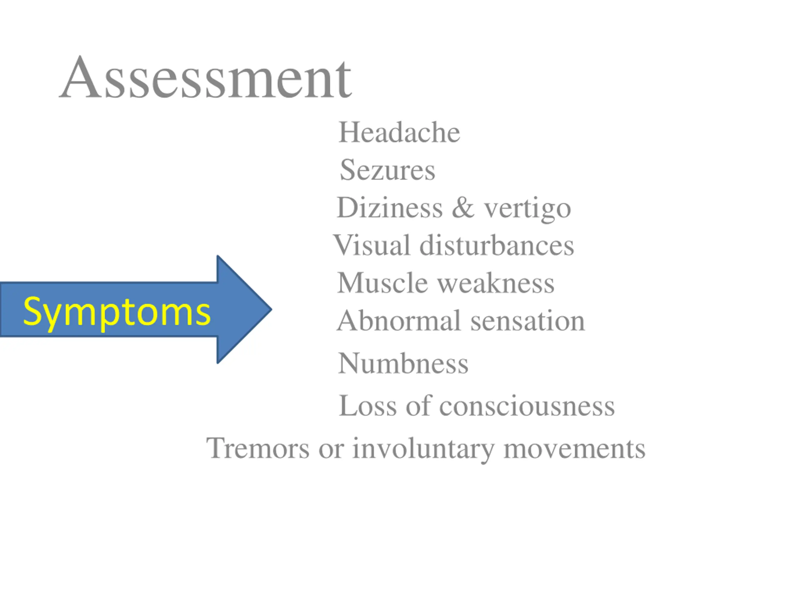 Assessment Headache Sezures Diziness & vertigo Visual disturbances Muscle weakness Abnormal sensation Numbness Loss of consciousness Tremors or involuntary movements Symptoms