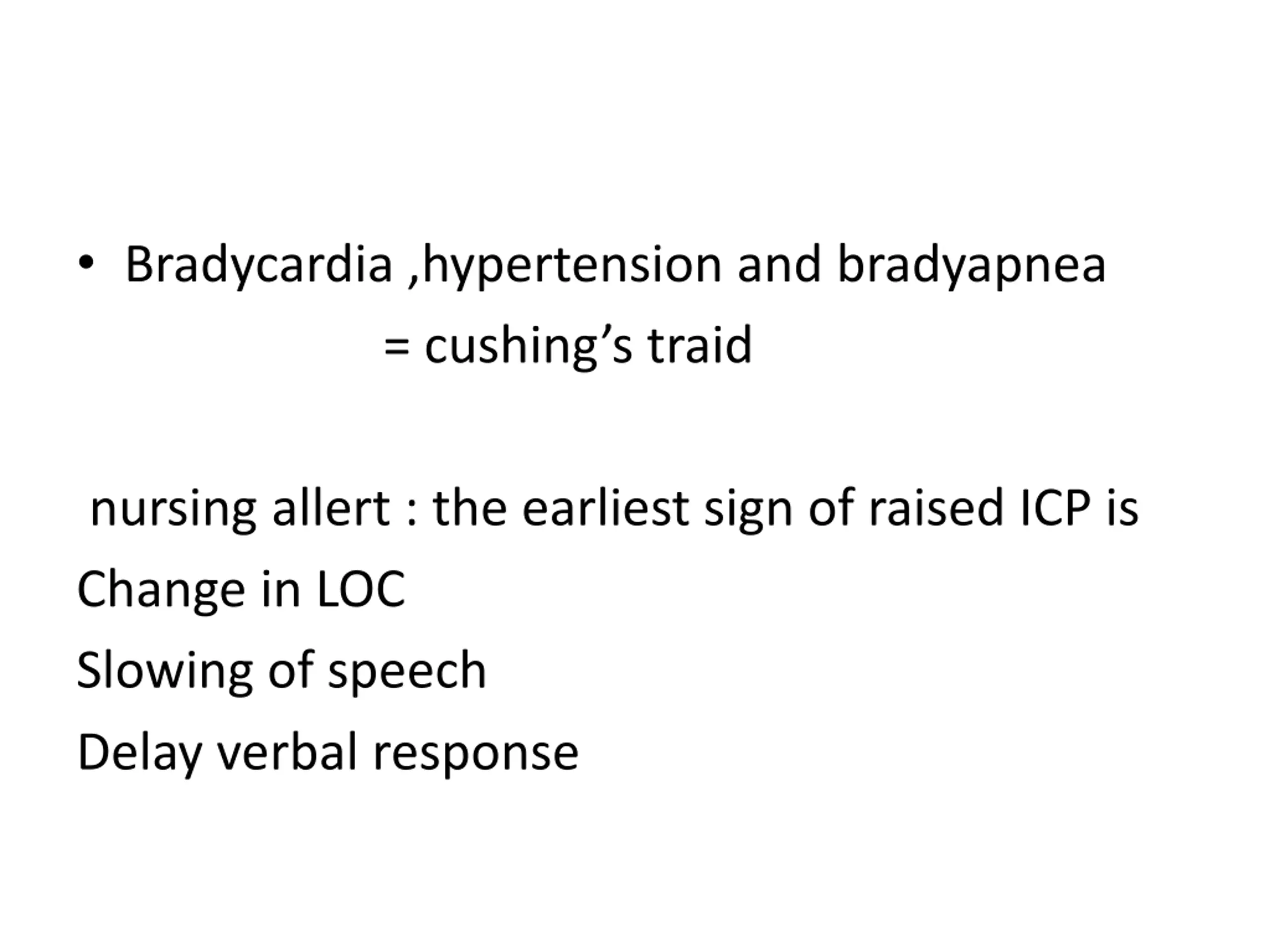 Bradycardia ,hypertension and bradyapnea = cushing s traid nursing allert : the earliest sign of raised ICP is Change in LOC Slowing of speech Delay verbal response