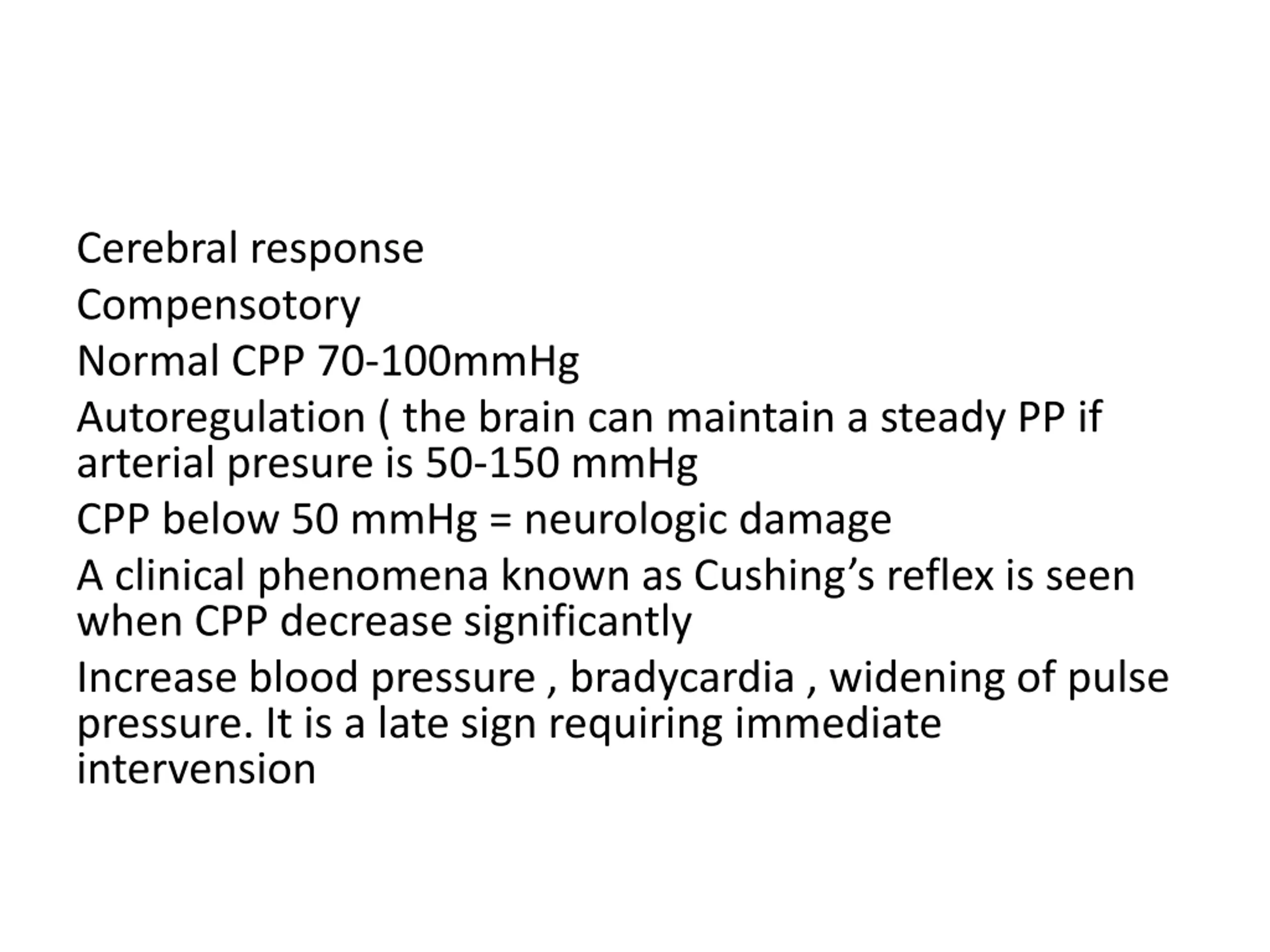 Cerebral response Compensotory Normal CPP 70-100mmHg Autoregulation ( the brain can maintain a steady PP if arterial presure is 50-150 mmHg CPP below 50 mmHg = neurologic damage A clinical phenomena known as Cushing s reflex is seen when CPP decrease significantly Increase blood pressure , bradycardia , widening of pulse pressure. It is a late sign requiring immediate intervension