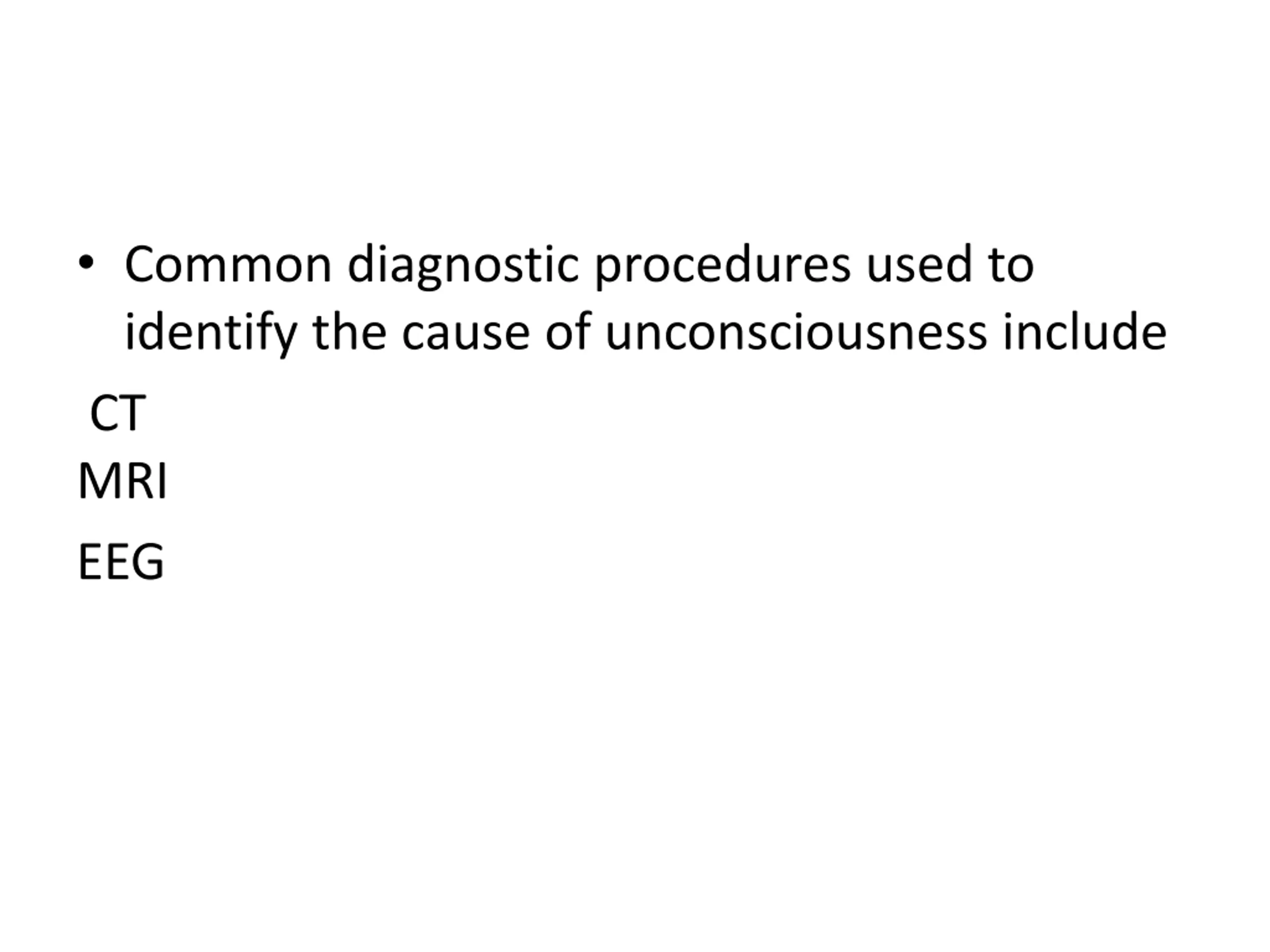 Common diagnostic procedures used to identify the cause of unconsciousness include CT MRI EEG