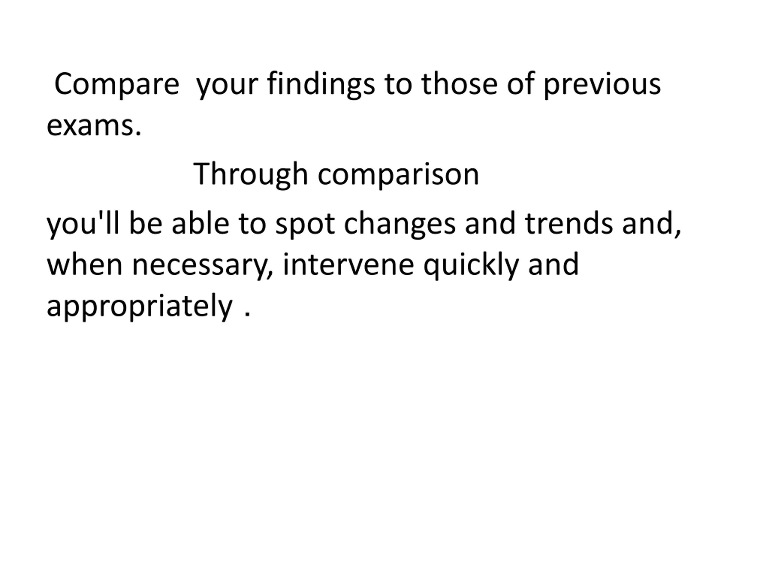 Compare your findings to those of previous exams. Through comparison you'll be able to spot changes and trends and, when necessary, intervene quickly and appropriately .