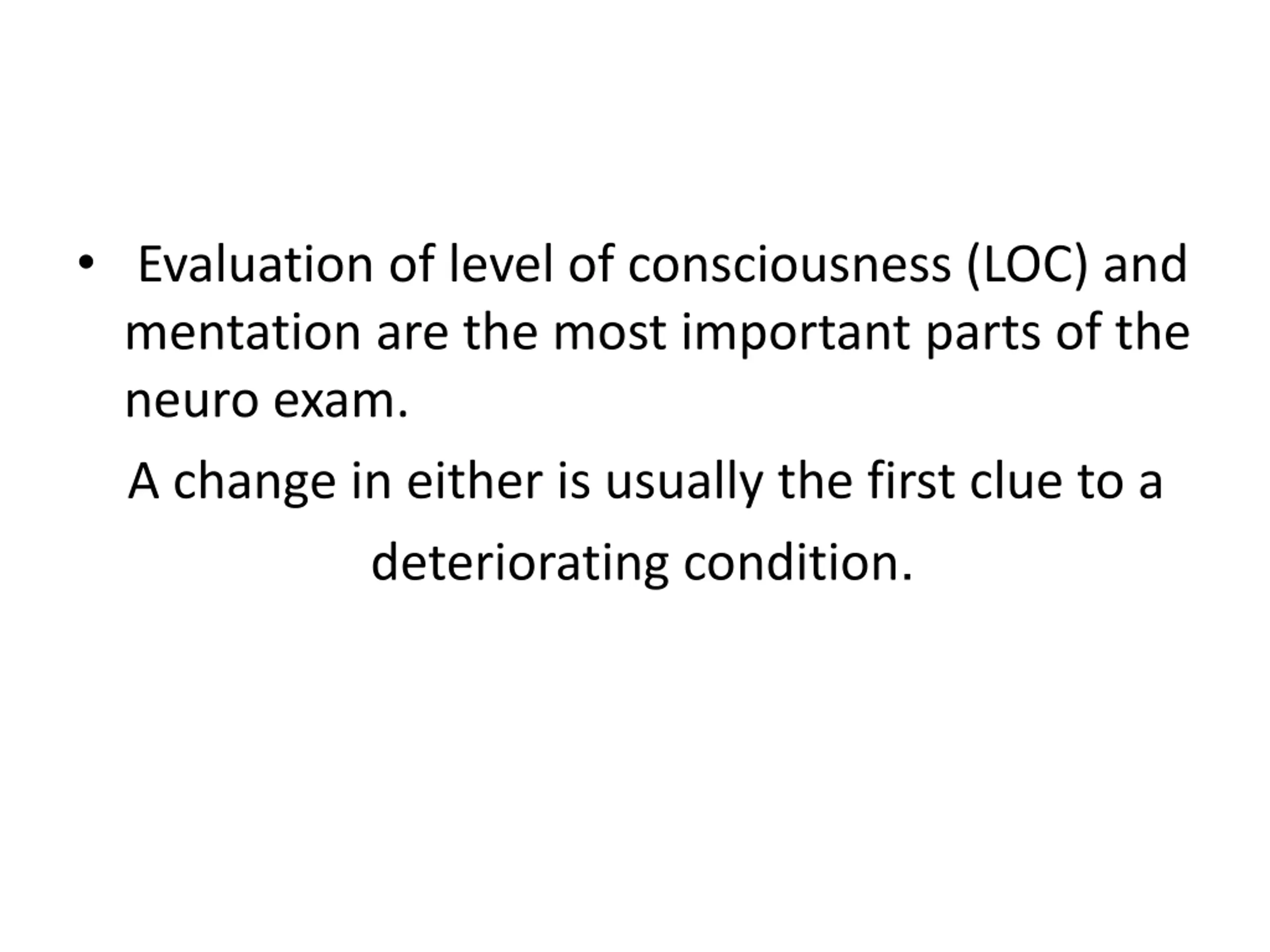 Evaluation of level of consciousness (LOC) and mentation are the most important parts of the neuro exam. A change in either is usually the first clue to a deteriorating condition.