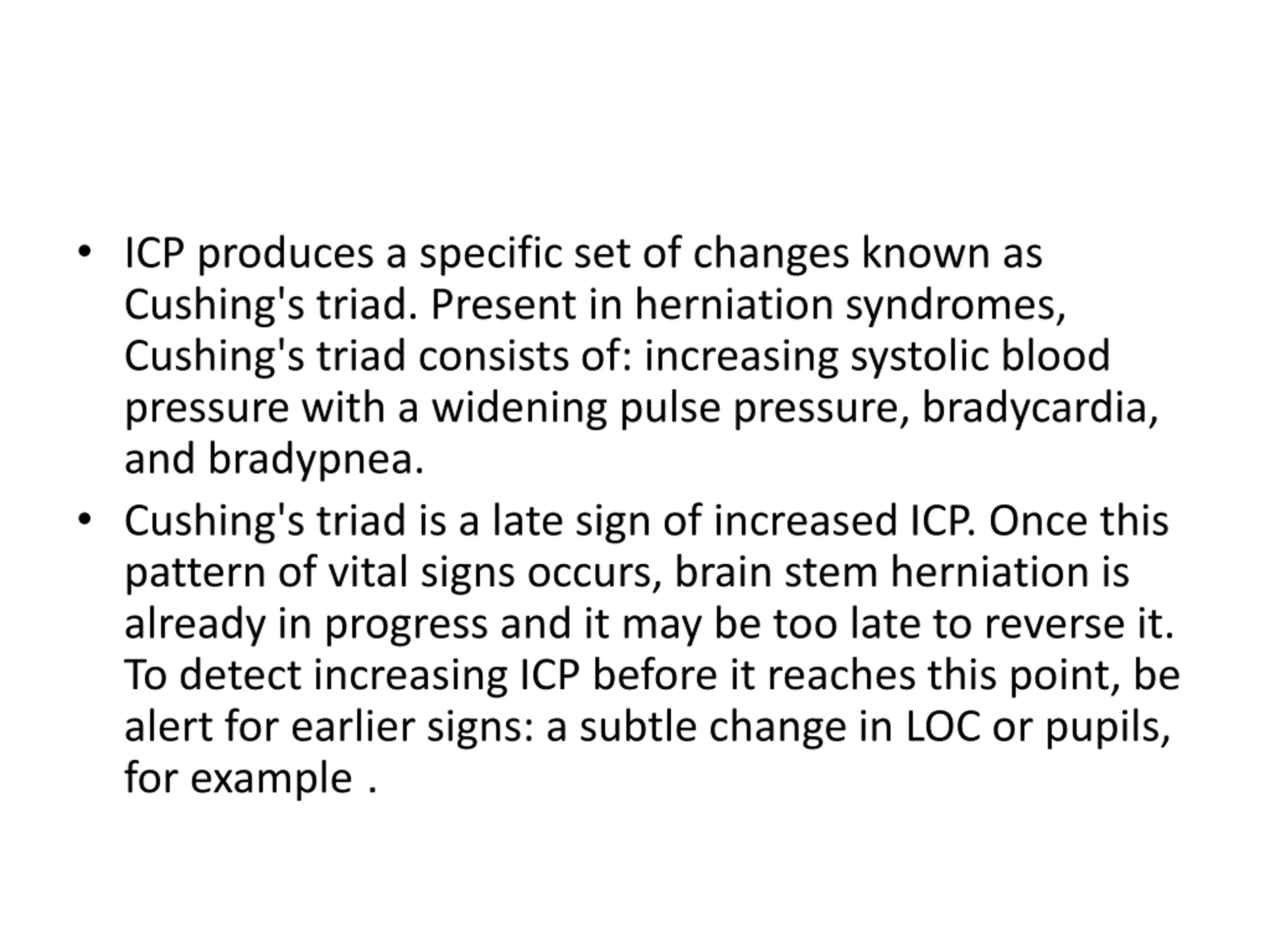 ICP produces a specific set of changes known as Cushing's triad. Present in herniation syndromes, Cushing's triad consists of: increasing systolic blood pressure with a widening pulse pressure, bradycardia, and bradypnea. Cushing's triad is a late sign of increased ICP. Once this pattern of vital signs occurs, brain stem herniation is already in progress and it may be too late to reverse it. To detect increasing ICP before it reaches this point, be alert for earlier signs: a subtle change in LOC or pupils, for example .