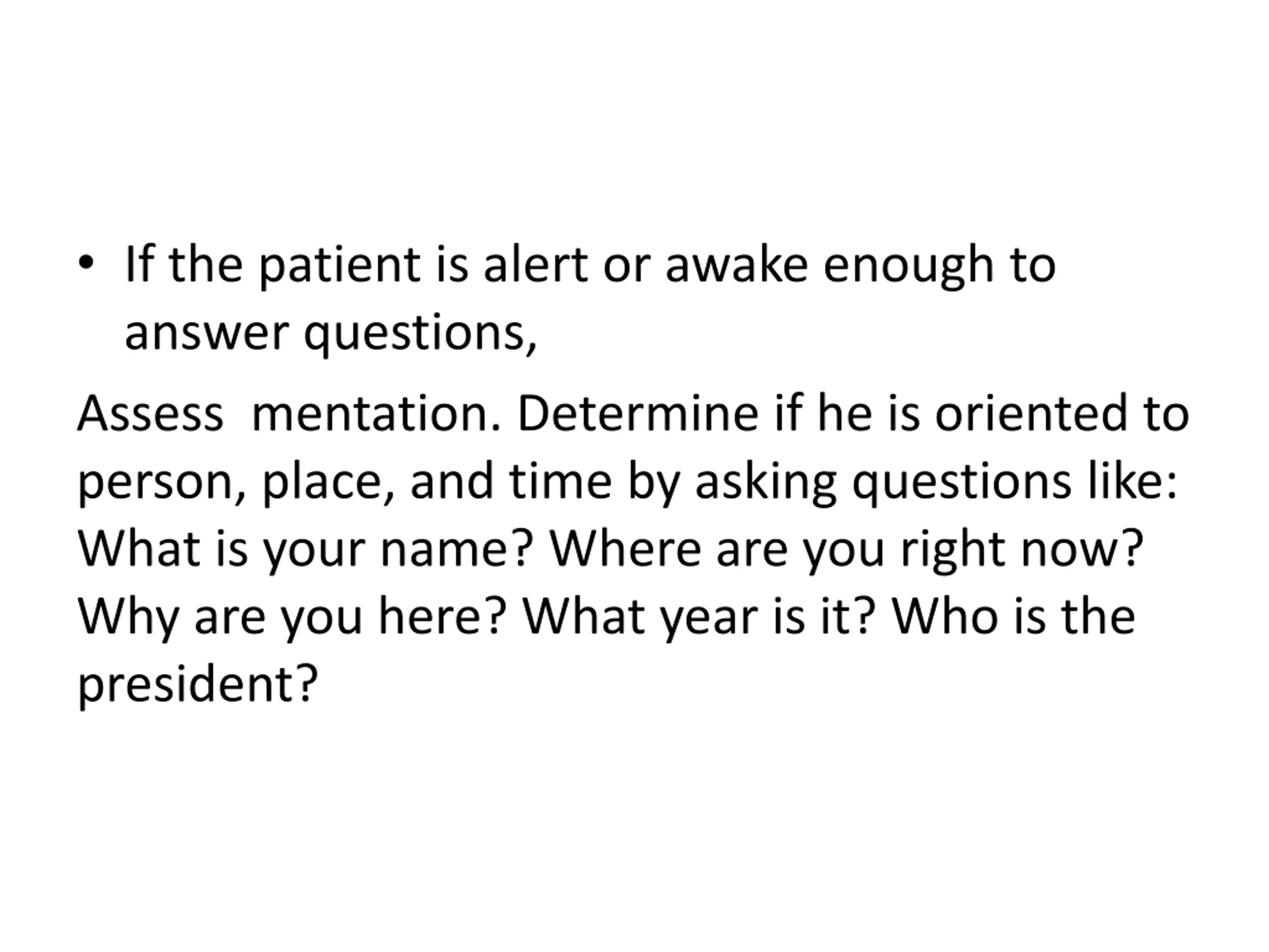 If the patient is alert or awake enough to answer questions, Assess mentation. Determine if he is oriented to person, place, and time by asking questions like: What is your name? Where are you right now? Why are you here? What year is it? Who is the president?