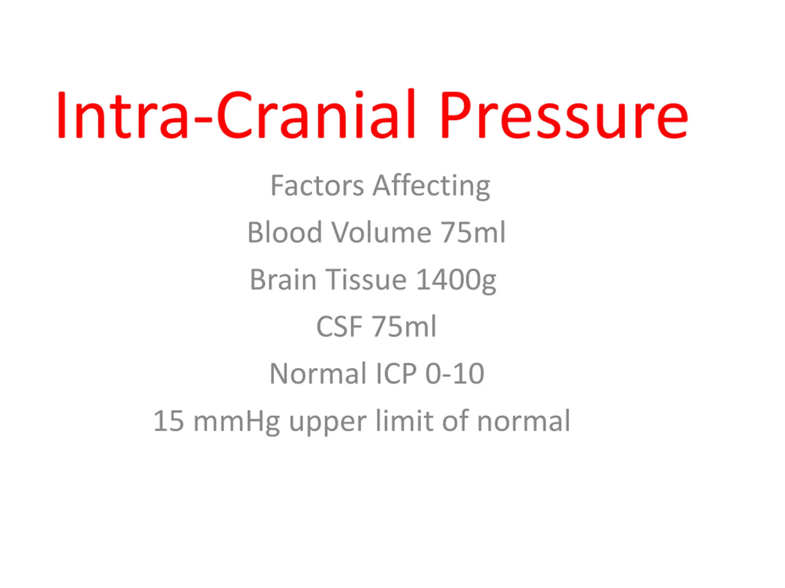 Intra-Cranial Pressure Factors Affecting Blood Volume 75ml Brain Tissue 1400g CSF 75ml Normal ICP 0-10 15 mmHg upper limit of normal