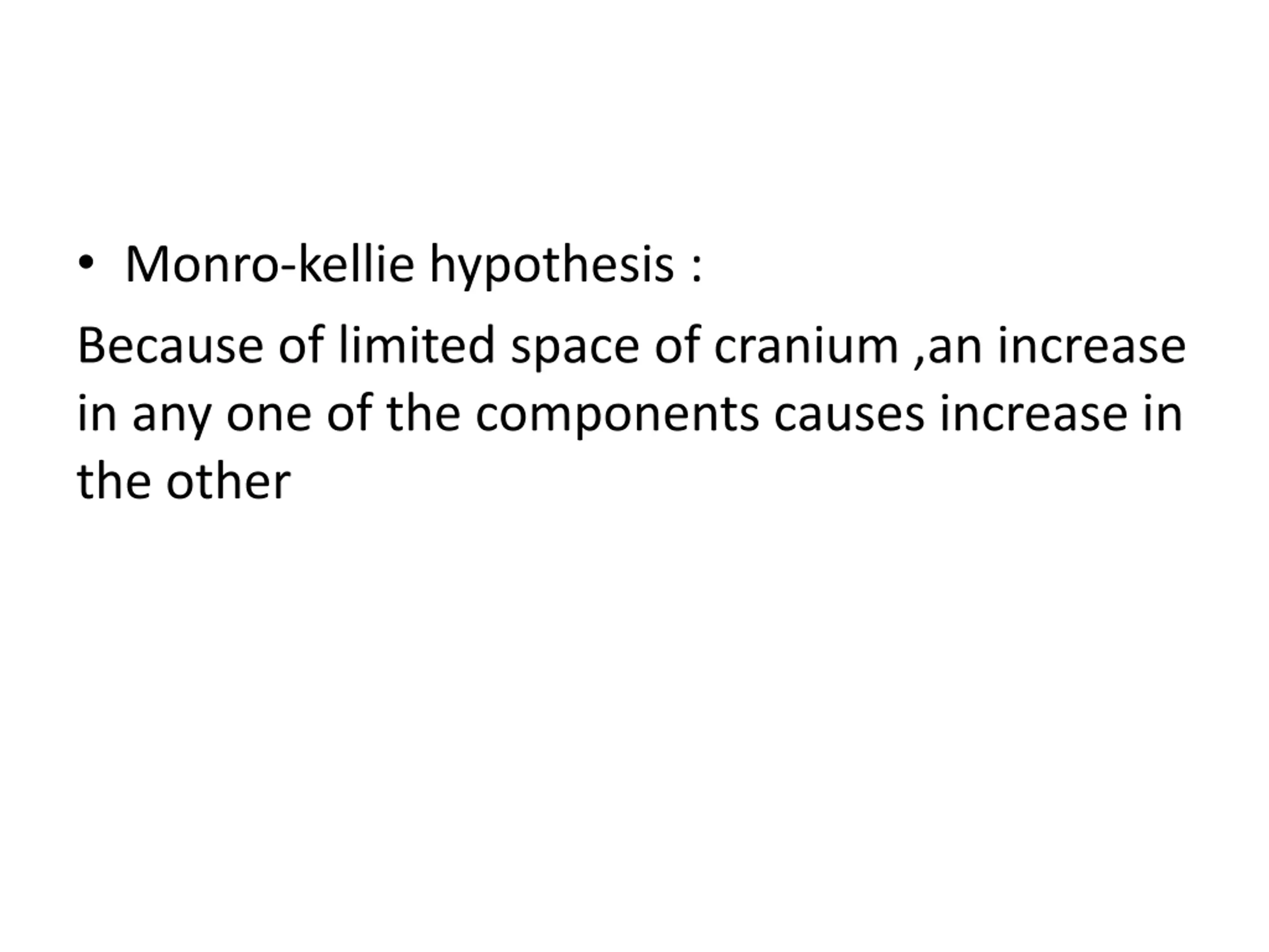 Monro-kellie hypothesis : Because of limited space of cranium ,an increase in any one of the components causes increase in the other