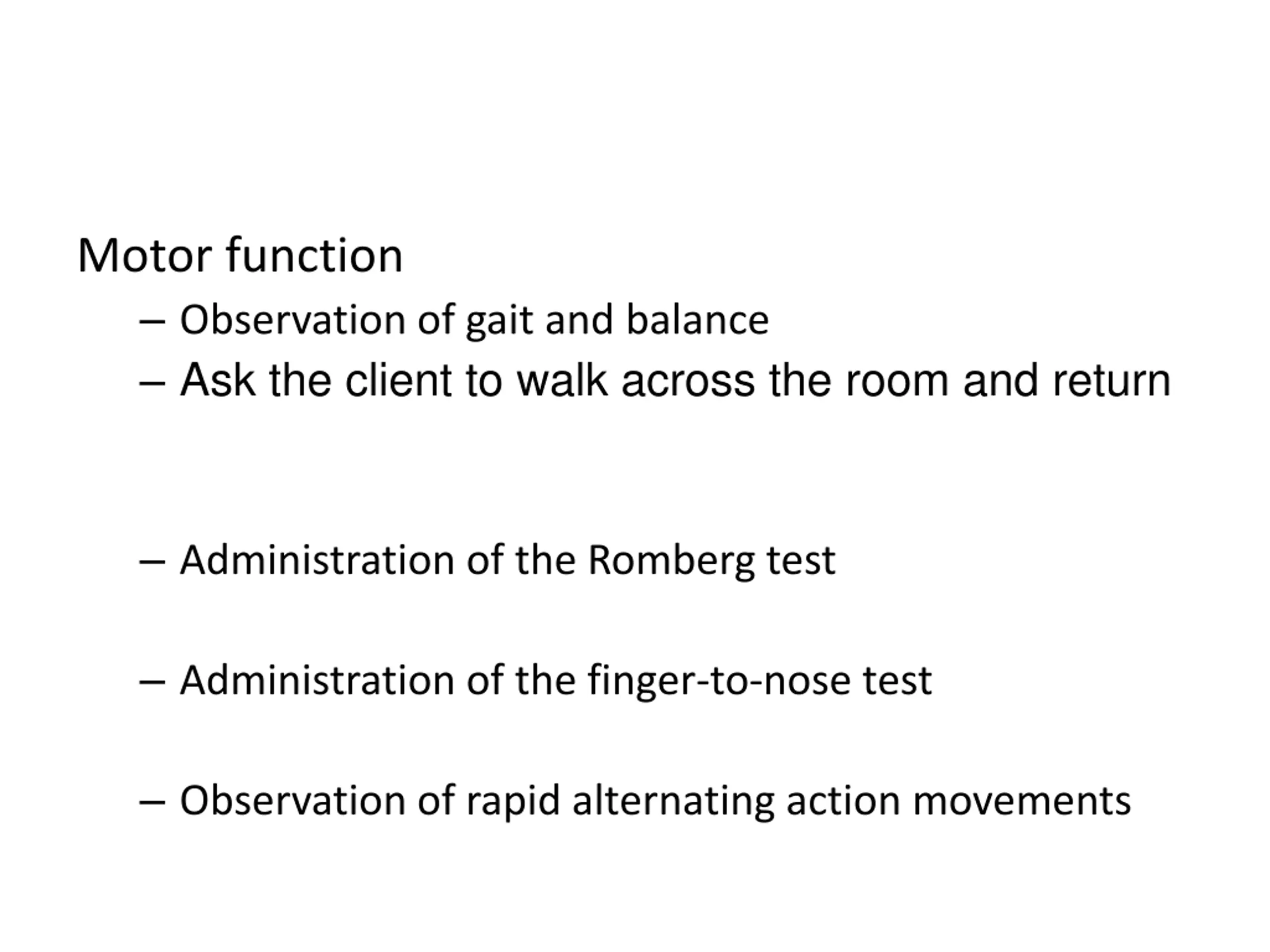 Motor function Observation of gait and balance Ask the client to walk across the room and return Administration of the Romberg test Administration of the finger-to-nose test Observation of rapid alternating action movements