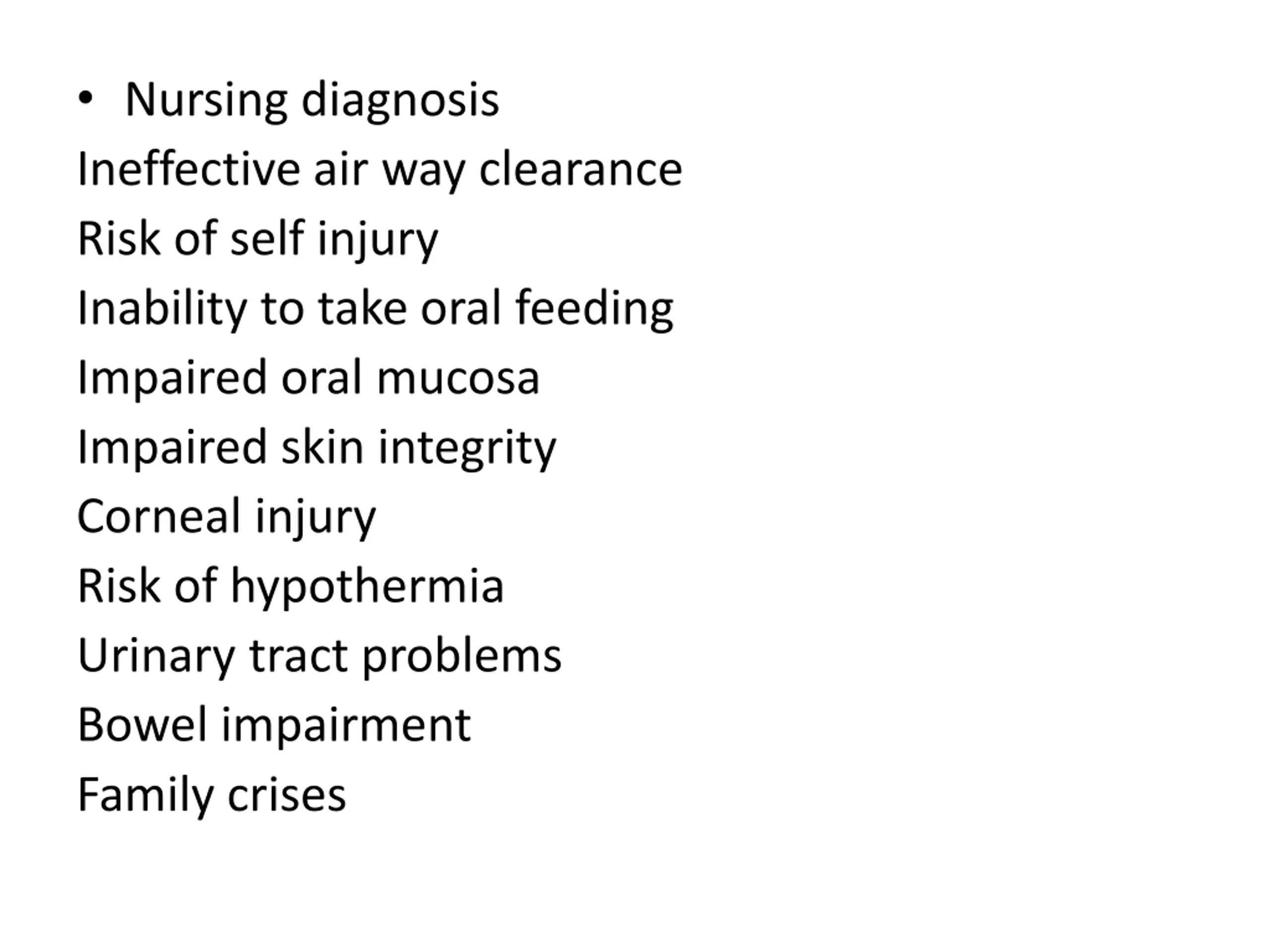 Nursing diagnosis Ineffective air way clearance Risk of self injury Inability to take oral feeding Impaired oral mucosa Impaired skin integrity Corneal injury Risk of hypothermia Urinary tract problems Bowel impairment Family crises
