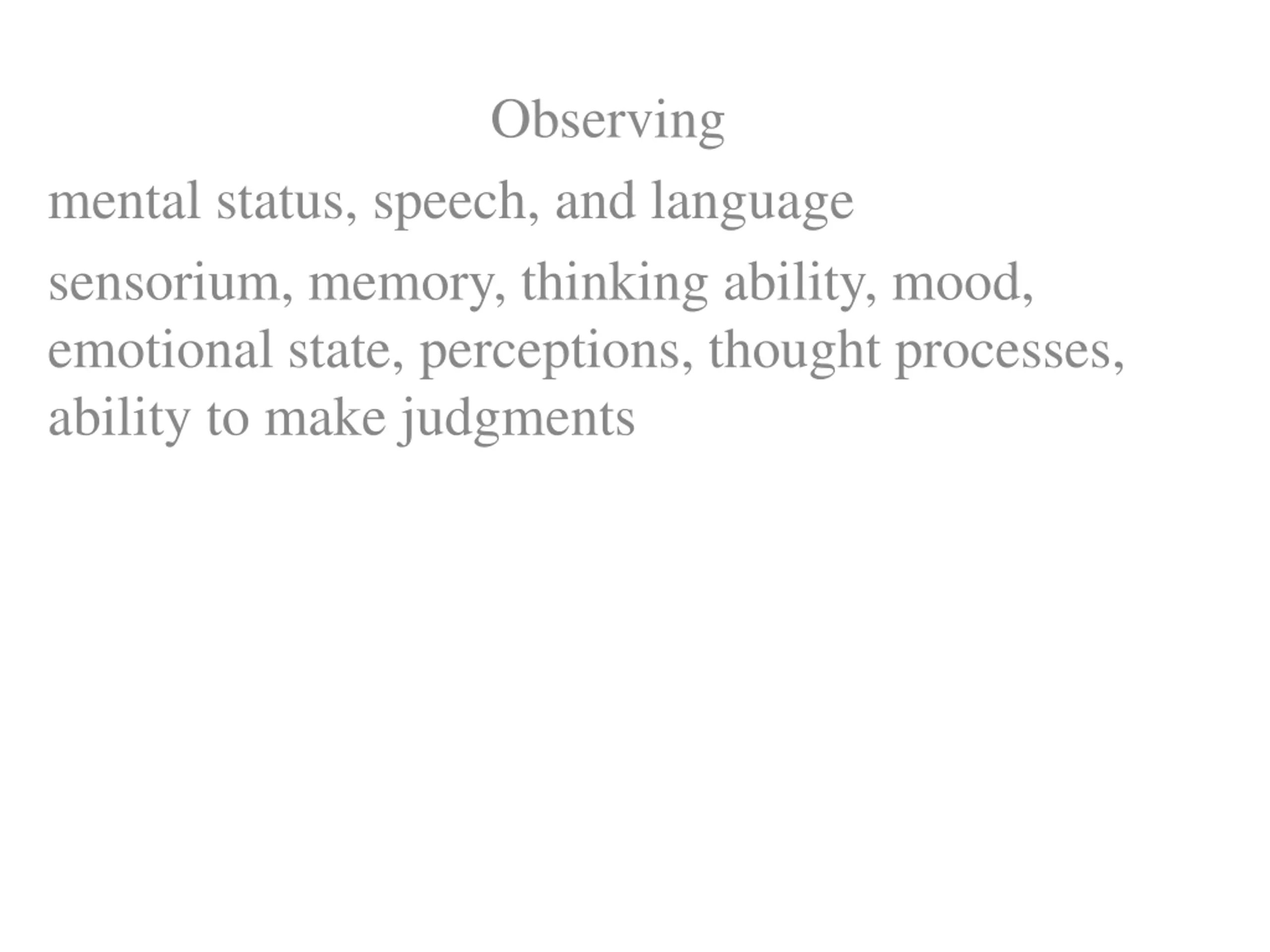 Observing mental status, speech, and language sensorium, memory, thinking ability, mood, emotional state, perceptions, thought processes, ability to make judgments
