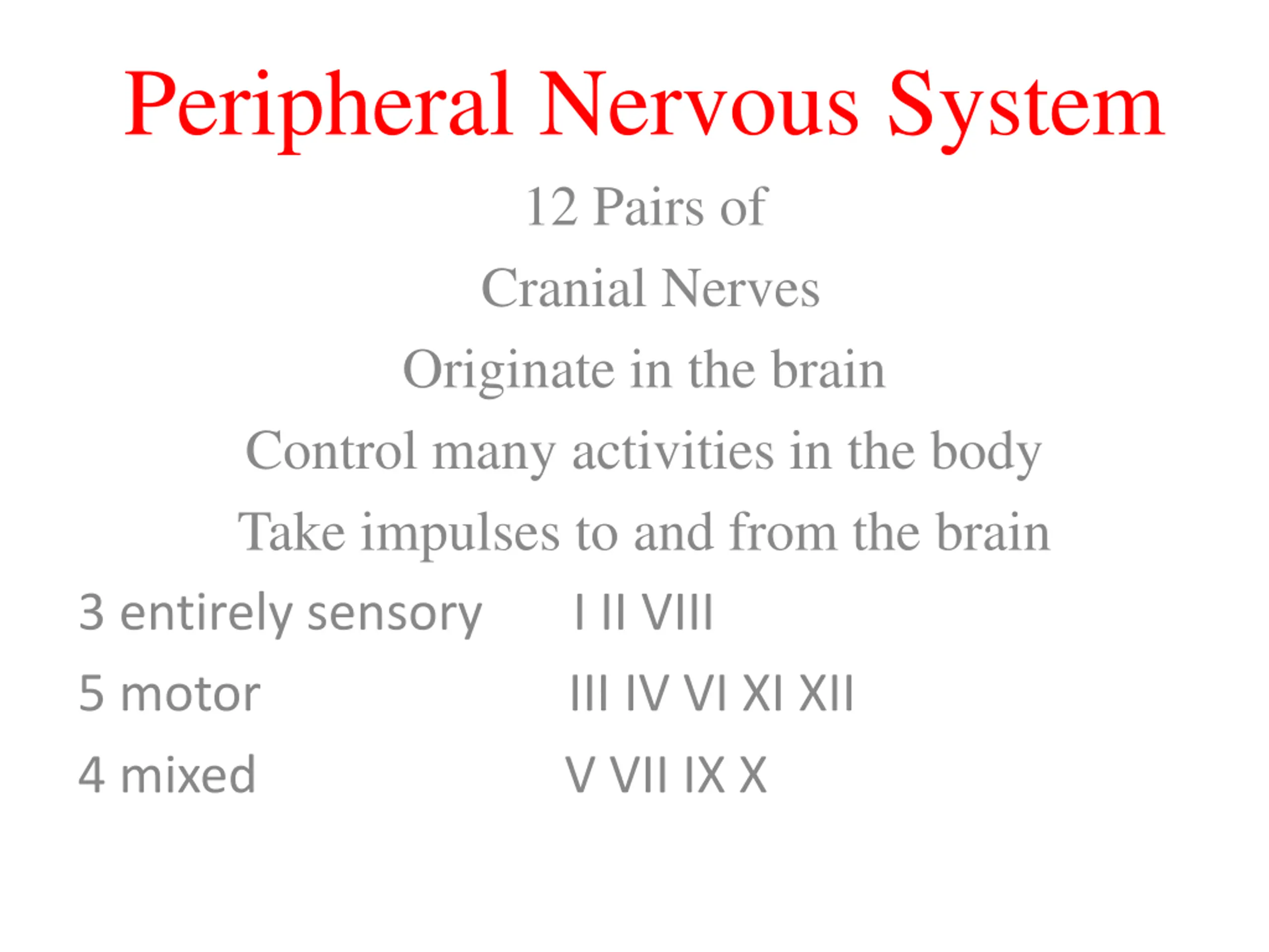 Peripheral Nervous System 12 Pairs of Cranial Nerves Originate in the brain Control many activities in the body Take impulses to and from the brain 3 entirely sensory I II VIII 5 motor III IV VI XI XII 4 mixed V VII IX X