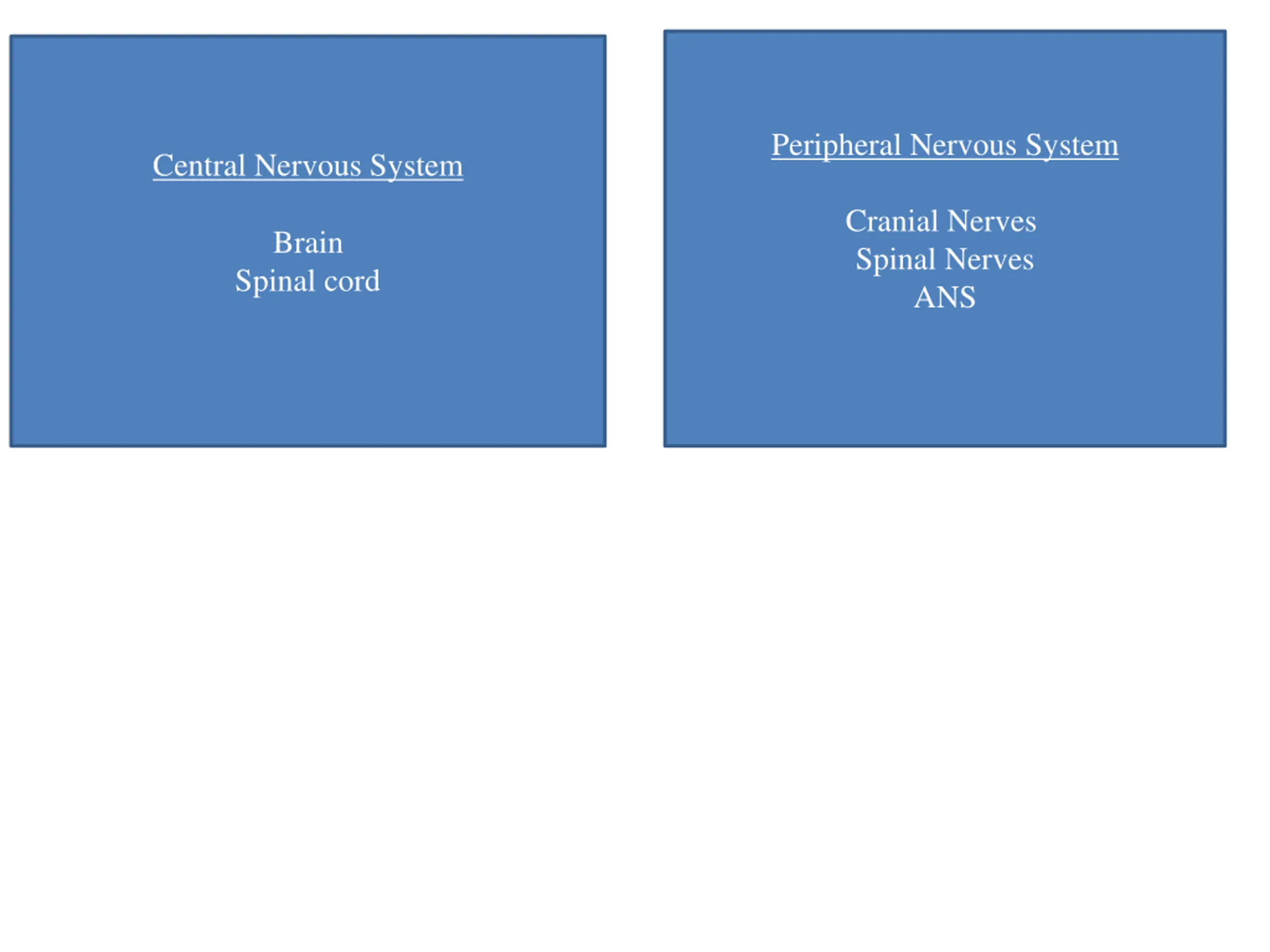 Peripheral Nervous System Central Nervous System Cranial Nerves Spinal Nerves ANS Brain Spinal cord