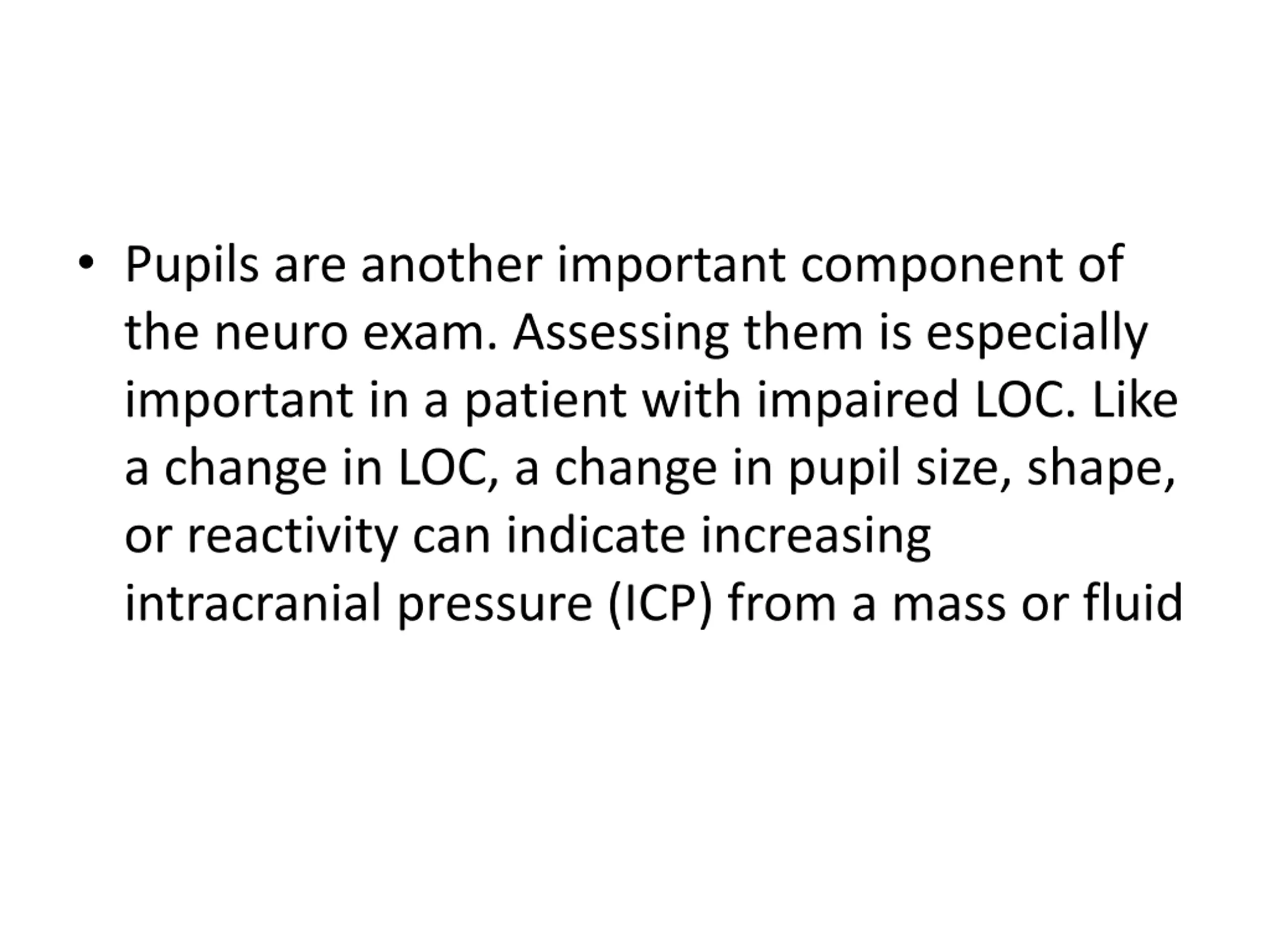 Pupils are another important component of the neuro exam. Assessing them is especially important in a patient with impaired LOC. Like a change in LOC, a change in pupil size, shape, or reactivity can indicate increasing intracranial pressure (ICP) from a mass or fluid