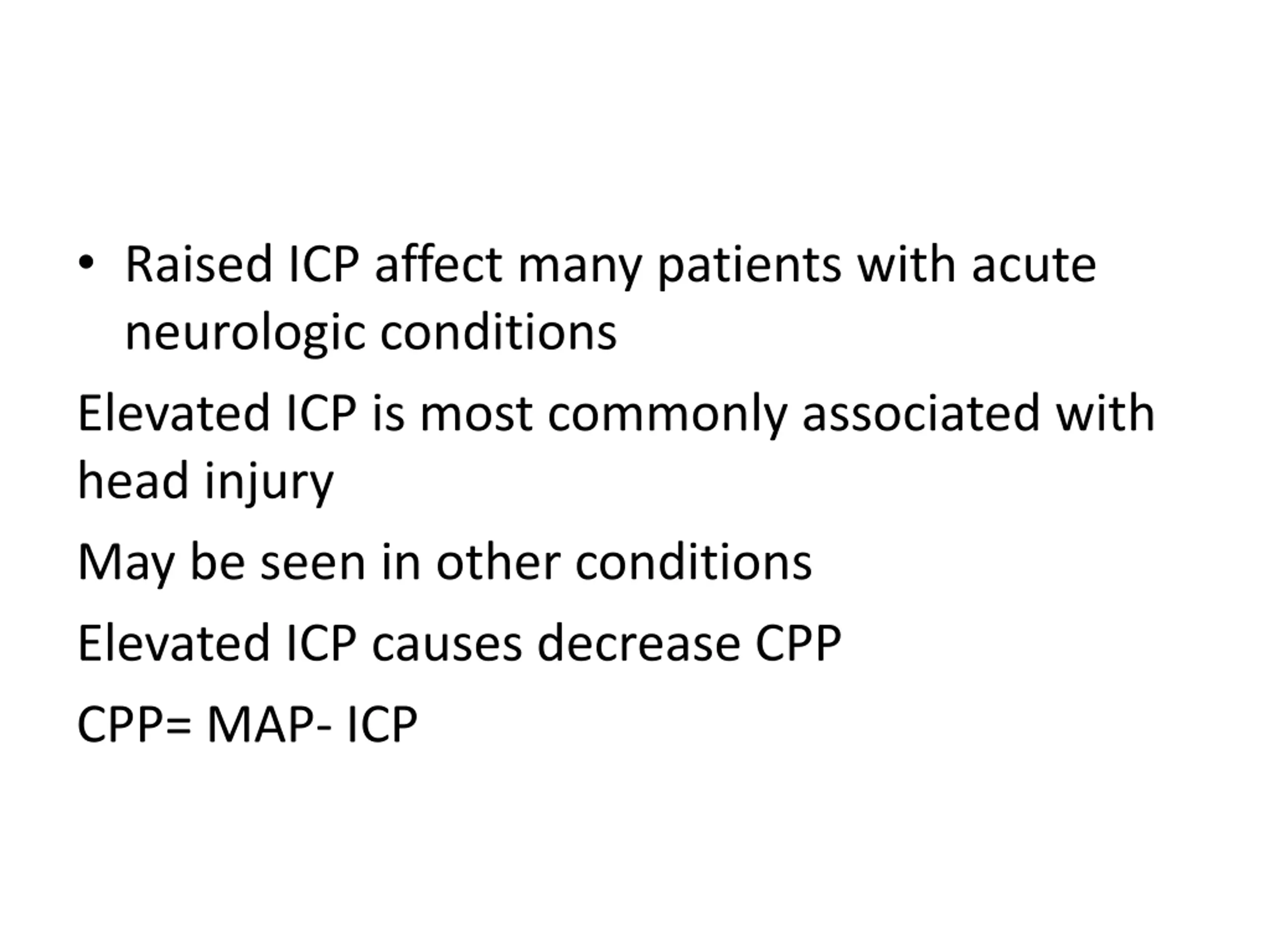 Raised ICP affect many patients with acute neurologic conditions Elevated ICP is most commonly associated with head injury May be seen in other conditions Elevated ICP causes decrease CPP CPP= MAP- ICP