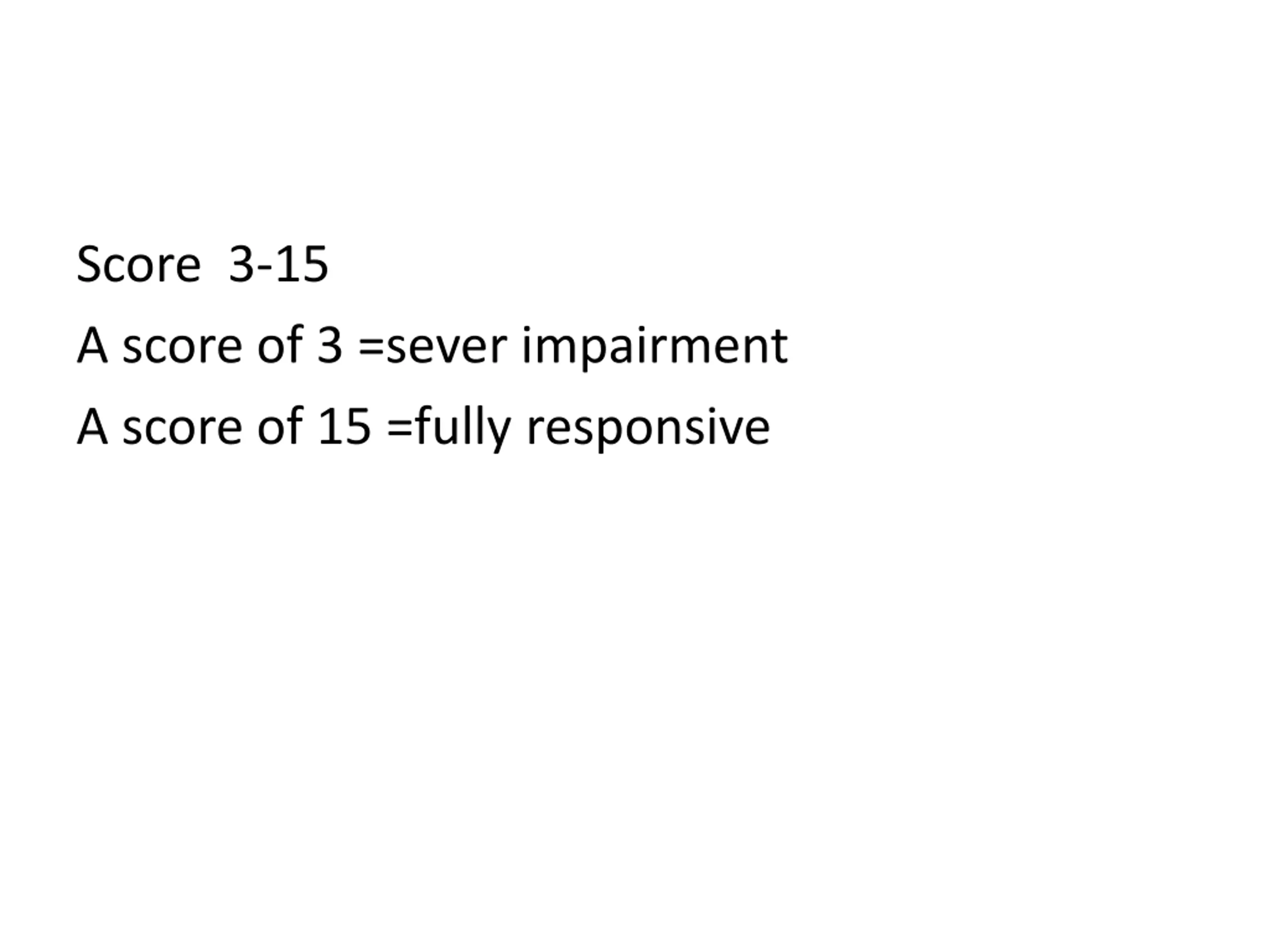Score 3-15 A score of 3 =sever impairment A score of 15 =fully responsive