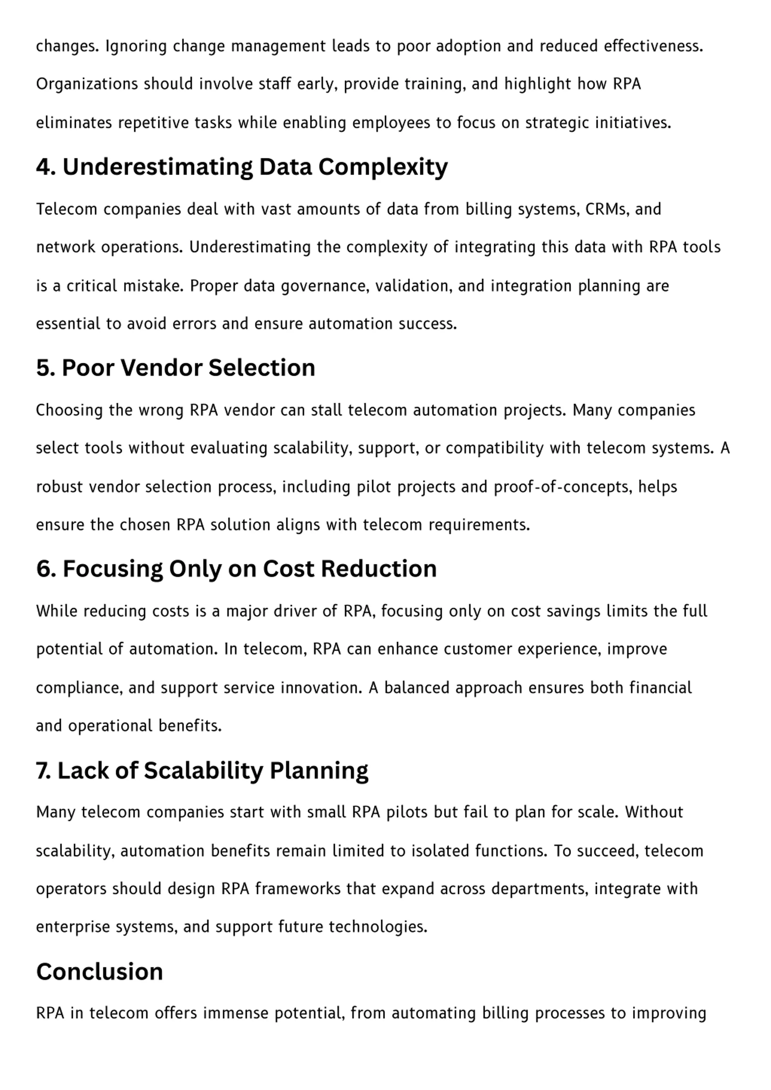 changes. Ignoring change management leads to poor adoption and reduced effectiveness. Organizations should involve staff early, provide training, and highlight how RPA eliminates repetitive tasks while enabling employees to focus on strategic initiatives. 4. Underestimating Data Complexity Telecom companies deal with vast amounts of data from billing systems, CRMs, and network operations. Underestimating the complexity of integrating this data with RPA tools is a critical mistake. Proper data governance, validation, and integration planning are essential to avoid errors and ensure automation success. 5. Poor Vendor Selection Choosing the wrong RPA vendor can stall telecom automation projects. Many companies select tools without evaluating scalability, support, or compatibility with telecom systems. A robust vendor selection process, including pilot projects and proof-of-concepts, helps ensure the chosen RPA solution aligns with telecom requirements. 6. Focusing Only on Cost Reduction While reducing costs is a major driver of RPA, focusing only on cost savings limits the full potential of automation. In telecom, RPA can enhance customer experience, improve compliance, and support service innovation. A balanced approach ensures both financial and operational benefits. 7. Lack of Scalability Planning Many telecom companies start with small RPA pilots but fail to plan for scale. Without scalability, automation benefits remain limited to isolated functions. To succeed, telecom operators should design RPA frameworks that expand across departments, integrate with enterprise systems, and support future technologies. Conclusion RPA in telecom offers immense potential, from automating billing processes to improving