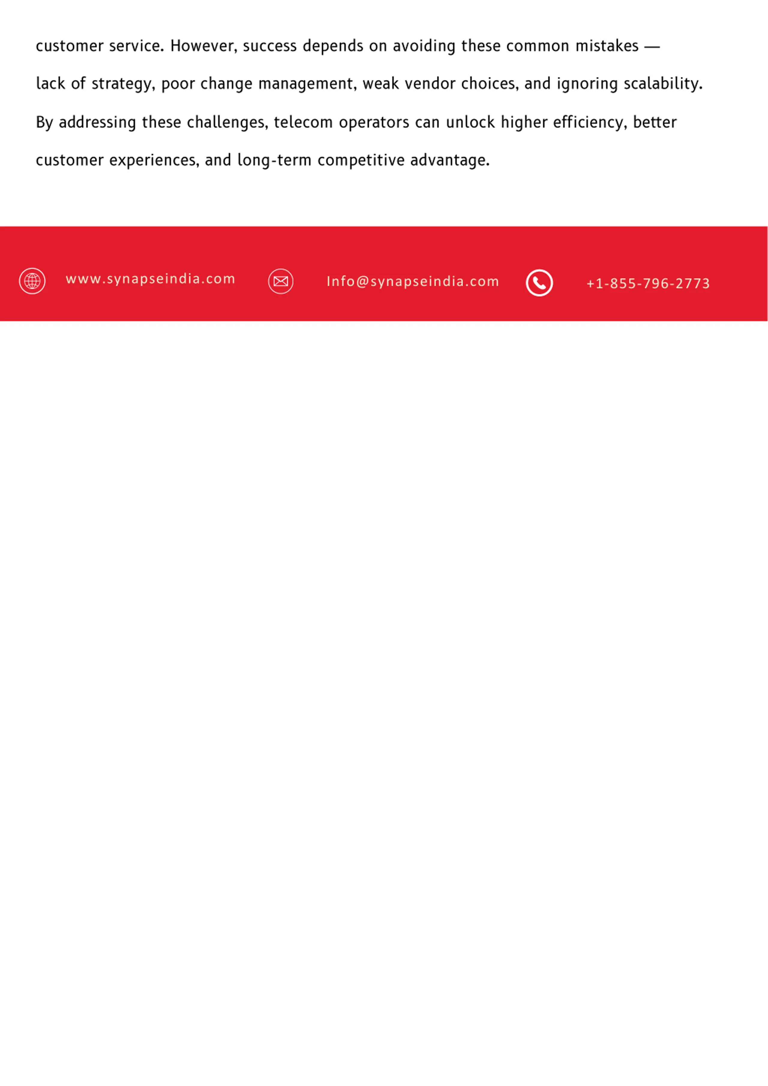 customer service. However, success depends on avoiding these common mistakes lack of strategy, poor change management, weak vendor choices, and ignoring scalability. By addressing these challenges, telecom operators can unlock higher efficiency, better customer experiences, and long-term competitive advantage. www.synapseindia.com Info@synapseindia.com +1-855-796-2773